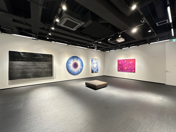 B1階展示室のテーマは「宇宙と重力」。土や生の素材を用いて、物質が神聖な存在へと変容する瞬間を「ギャラクシー」と名づけたボスコ・ソデイの絵画が象徴的に左右の壁面を埋め、周囲には皆既日食の記録写真をもとに描かれたマーク・クインの「Anthropocene」シリーズから、ゲーム内に仮想的につくられたものを絵画で表現した多田圭佑による 「trace」シリーズまでが並ぶ。