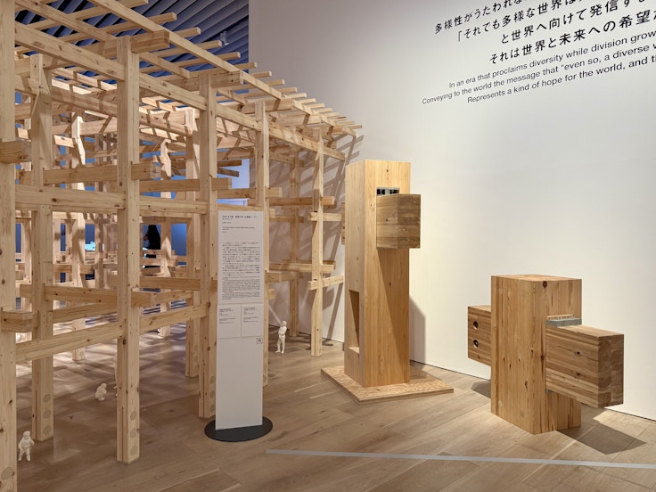 展示室には、この《大屋根リング》の一部を5分の1スケールで再現した、高さ4メートルを超える巨大模型が鎮座する。加えて、構想段階における藤本のスケッチ、設計の変遷をたどる資料や写真、そして特徴的な「貫(ぬき)」接合工法を実物大で体験できるモックアップも展示されており、建築の構造的・技術的な側面にまで踏み込んで紹介されている。