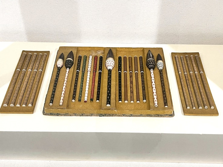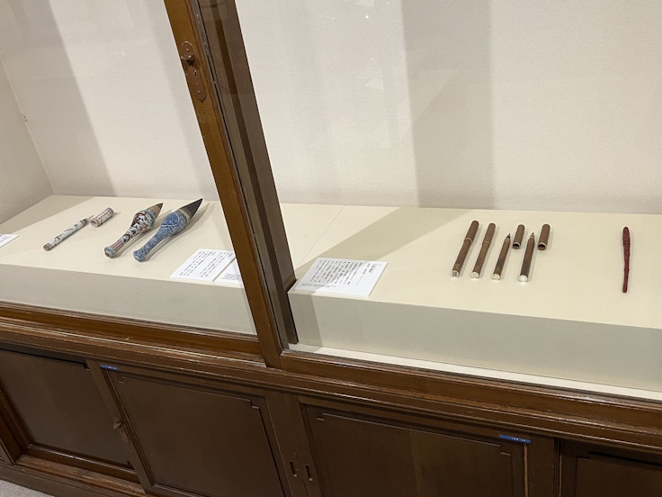 文房四宝でもっとも長い歴史を持つ筆は、殷時代(紀元前16~11世紀)の「聿(いつ)」に始まり、戦国時代の遺跡からは兎毛と竹軸の「無芯筆」が出土している。漢時代には芯となる毛に紙を巻き、さらに毛を巻いた「有芯筆」もつくられたようで、これは日本にも伝わり、正倉院に残っている。その後は中国と日本の両国で素材や構造が変化していく。筆の毛には、兎、馬、鼬(いたち)、鹿、山羊など様々な素材が見られ、軸(筆管)は、黒檀や陶磁のほか、象牙、玉(ぎょく)といった高級な素材を使ったものもつくられるようになった。朱漆を何十層にも重ねてそれを彫刻する堆朱(ついしゅ)や「寿」の文字を表すなどの装飾も見られる。筆を立てるための筒には、文人趣味らしく、賢人や故事にもとづいた精緻な図が彫られているので、その技も楽しみたい。