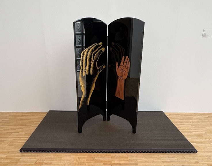 同じ会場には、2000年にロンドンで結成したアーティスト・コレクティヴのアバケ/オバケの作品が展示されている。アバケは、アーティスト、出版社、作家、教育者、デザイナーで構成されており、本展には、輪島塗でできた《The Handshake》が展示されている。輪島塗は、各工程の専門家が順に作業し完成させるが、その専門家同士は同じ土地に生きているにもかかわらず、出会う機会がないという。その状況に疑問を抱き、ひとつの作品のなかで、違う技術によってつくられたものを並列関係に置くという作品が生まれた。