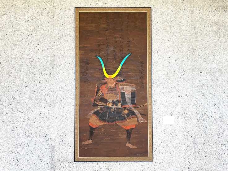 外光が入ってくるこの展示室では、《ENARGY KNOT》(2025)や《Energy Notch》(2023)といった平面作品の、兜や鎧に使われている蛍光色が鮮やかに発色することも見逃せない。実用的な武具でありながら、同時に過剰なまでの装飾を与えられた鎧という存在に宿る、美意識の在処を問いかけてくるようだ。