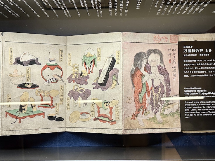 展示は能舞台だけでなく、徒歩すぐの第2会場(歌舞伎ソシアルビル 9階)にも広がる。ここでは歌川国虎の《センリキヤウ》(1824)に注目したい。同作は、2図で1組をなす作品。ひとつは俯瞰図で、もうひとつは男女がまぐわう場面だが、じつは俯瞰図のほうにも密かにまぐわう男女の姿が細かく描きこまれている。