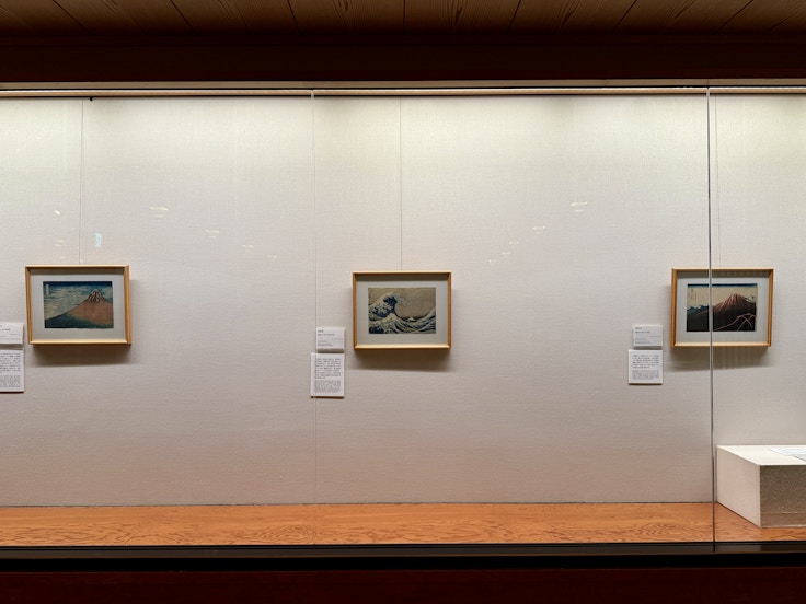 展覧会の冒頭では、《神奈川沖浪裏》《凱風快晴》《山下白雨》といった「三役」が紹介される。荒れ狂う波と静謐な富士の対比が印象的な「浪裏」、朝焼けに染まる「赤富士」、稲妻を背にした「黒富士」など、誰もが知る名画が並び、それぞれに北斎ならではの視点と構図の妙が込められている。