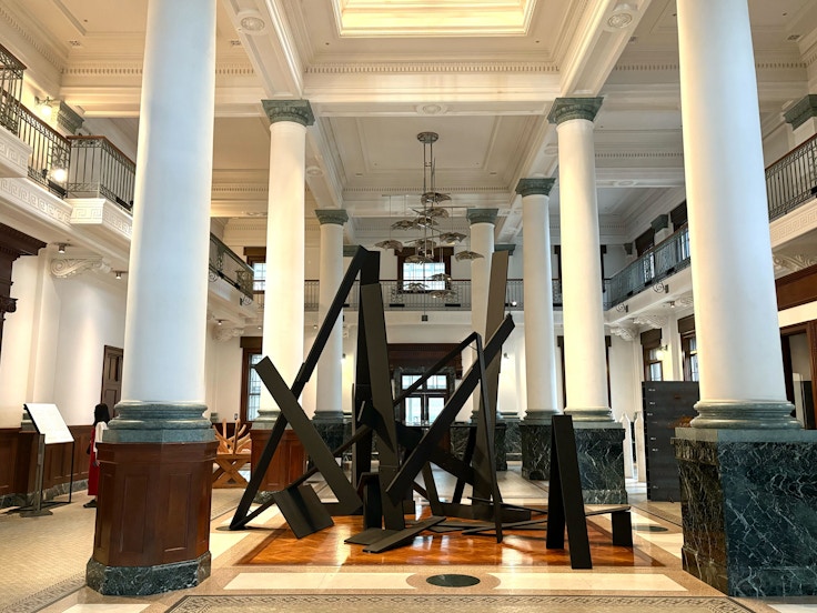 本展は同館内1階にある、1927年築の旧川崎銀行千葉支店を保存したさや堂ホールも会場のひとつとなっている。ここでは、1997年に同館で開催された「超克するかたち一彫刻と立体」展の再現展示が行われている。当時のメインビジュアルや挨拶文も掲示されており、28年前にこの場所で開催された展示を追体験できるような工夫がなされている。