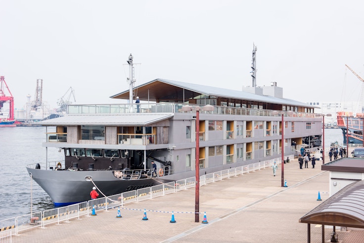 guntûの船内に入る前に、まずは船体の外観デザインについて触れたい。瀬戸内の風景と馴染むように設置された切妻屋根と、シルバーの船体が特徴だ。海や空の色を反射して、船体が海と一体となって見えるようにという意図からボディカラーが選ばれた。