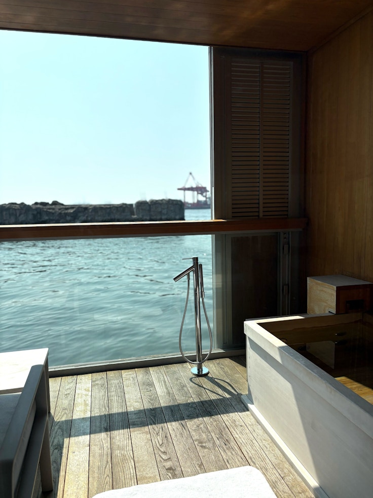 続いて「テラススイート 露天風呂付き」は、名前の通り露天風呂が備わった客室だ。船上の風を感じながら湯船に浸かることができるようになっているが、ほかの船や島に近づく際は雨戸やブラインドを閉め、プライベートも守られるようなつくりとなっている。窓のすぐ側にベッドがあるのも特徴のひとつで、朝起きてすぐに眼前に広がる海を堪能できる。
