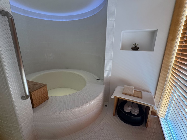 2階には、客室以外にスパエリアも併設されている。檜の浴槽とスチームサウナ/ドライサウナが備わる浴場やジムが用意されており、客室の外でも存分にguntûでの時間を楽しむことができる。宿泊者それぞれの過ごし方にあわせて利用可能時間が朝6時から23時までと長めに設定されているのも嬉しいポイントだ。