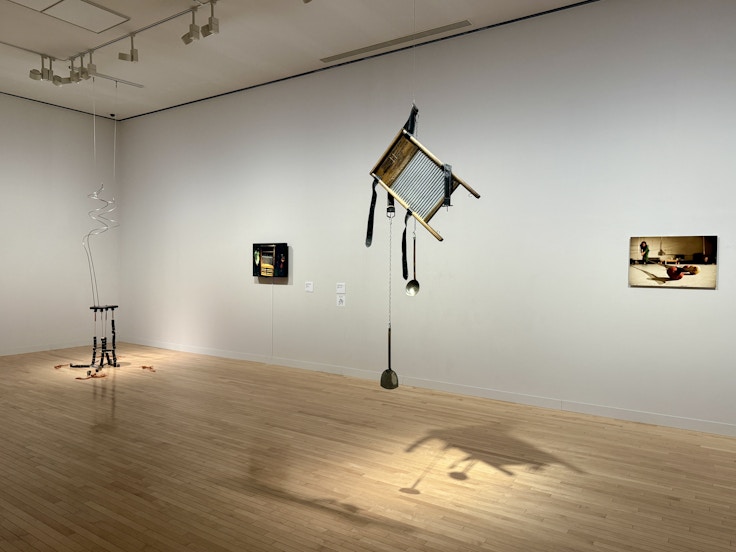 同じ展示室には、2009年に発表された《Secrets of My Mother’s Child(母の娘の事実)》の映像や関連立体《X ✕ Y=1》が並ぶ。椅子の脚部を輪切りにし、そこに紐を通して吊り下げた立体作品は、一見すると座れる家具のようでありながら機能を失っている。パフォーマンスでは、その紐をX軸とY軸に見立て、人と人との距離と緊張関係を漸近線として図式化するなど、数学的発想を空間に持ち込んだ。岡村は、「笹本はもともと数学者を志していたこともあり、初期作品には数学の図式を空間の中で身体的に体現し、その中に自身の身体を置いてみるといった試みが繰り返し登場する」と語る。