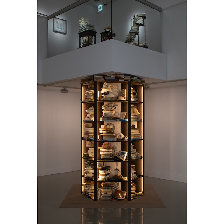 同ギャラリーの特徴のひとつである吹き抜けを生かした《Strata》(2025)は、500冊にもおよぶ自然環境にまつわる本と約100つの化石や鉱物で構成された、いわば時間の層だ。一番下の先カンブリア時代に始まり、一番上は現代にもっとも近く、政治や経済活動において著名な人物の書籍が積み上げられている。2つのフロアを縦断するこの層を通じて、我々に人間がどのような歴史の上に立っているのかを改めて認知することができるだろう。