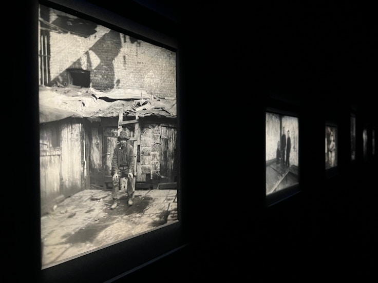 展覧会冒頭に並んでいる写真は、同館コレクションのジェイコブ・リースによる写真群となる。コスタは映画『ホース・マネー』(2014)の冒頭で、19世紀末から20世紀初頭にかけてのニューヨークの貧困地域をとらえたリースの写真を写したが、本展でもまたコスタが選んだリースの作品が並ぶ。