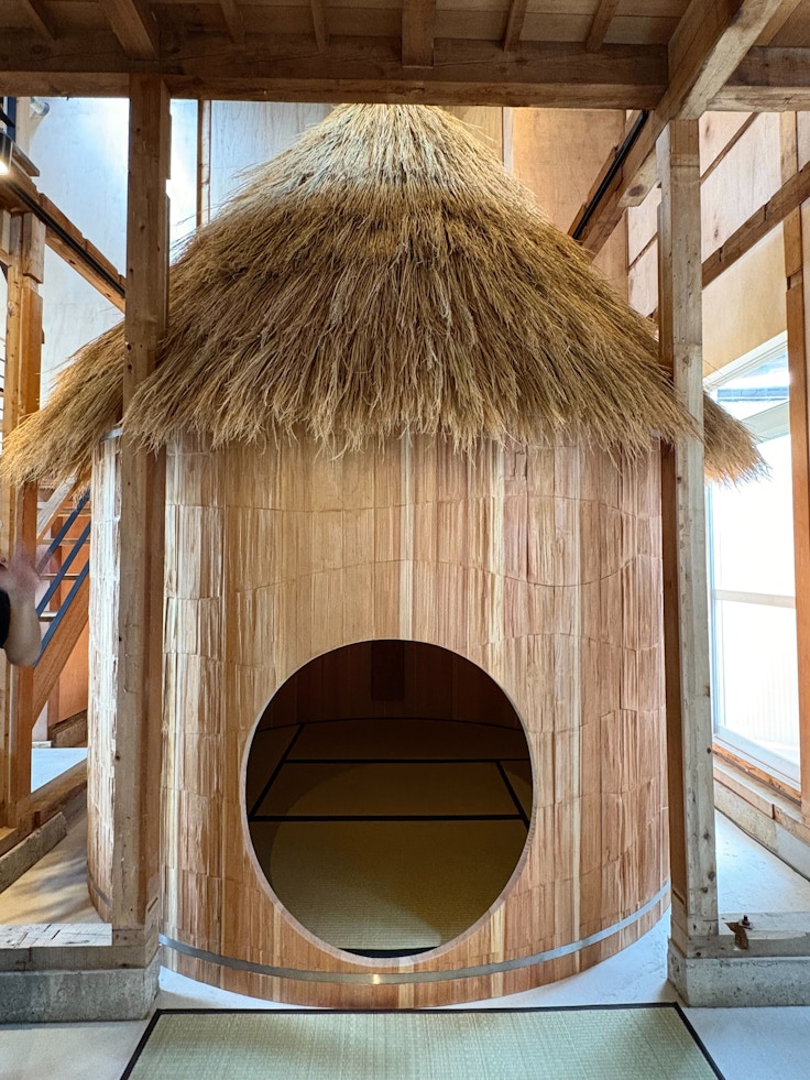 本作は、木桶を建築に取り入れることに挑戦し制作されたもの。大きな木桶の中に畳が敷かれており、来場者は中に入ることもできる。