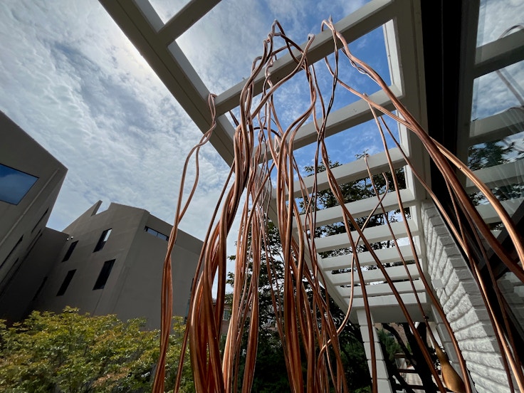 《In the Wake of Reflections》の金属の管は2階のベランダの屋根にまで伸びており、2階から屋外に出て、彫刻のディテールをじっくり見ることも可能だ。