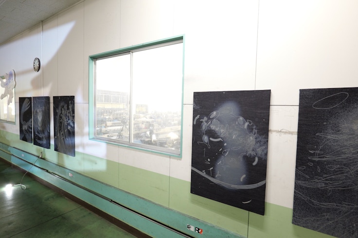 今回のレジデンスで米澤が制作した新作群「光の傷」は、9月9日にプレビュー、10日に地元市民に向けて公開された。これらの作品は10月に、パリで展覧会として発表される予定だ。今回のレジデンスで米澤は、デニム生地そのものを「宇宙」としてとらえ、生地に対する加工を「光の傷」として、様々なメディウムによって表現したという。まずはクロキの本社工場のなかで展開されている展覧会をレポートしたい。