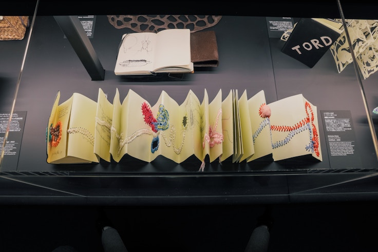 また、南アフリカのアーティスト、ニコラス・ロボによる《無題》(2009)は、アフリカの伝統や古代神話を探求する刺繍の連作である。ハードカバーのノート全体にリボンを縫い込み、ページの間からはゴム製の彫刻が立ち上がる。手仕事と物語が交差するこの作品は、ノートブックという媒体の枠を超え、彫刻的かつ神話的な世界観を表している。