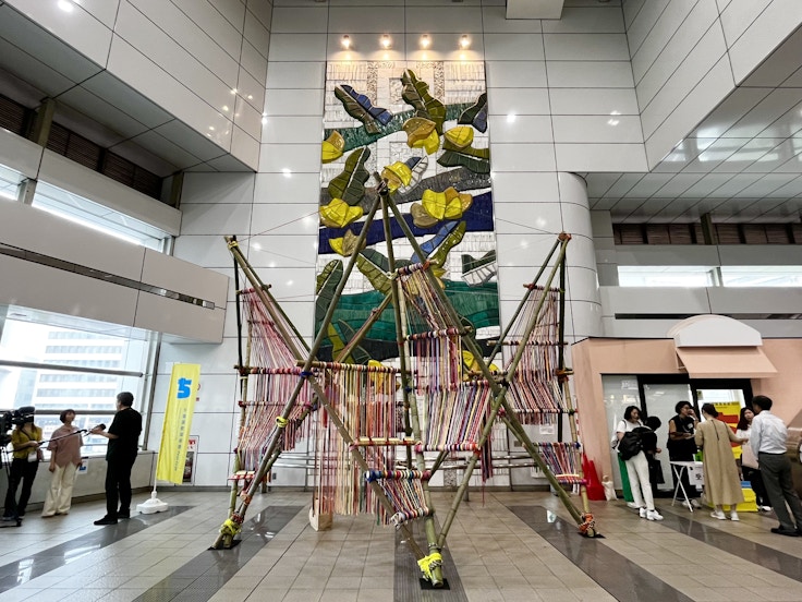 色彩の美しい陶板レリーフとストリートピアノが設置された千葉都市モノレール千葉駅改札外では、オーストラリア・メルボルンを拠点とするスロー・アート・コレクティブによる参加型作品《STATION to STATION》が設置されている。竹の構造体にめぐる紐は、鑑賞者が自由に編んだり結んだりすることが可能だ。日常空間のなかに現れたちょっとした非日常を楽しむことができるだろう。