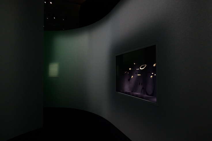 西澤による会場設計の妙は、新館でも大いに発揮されている。視線を巧みに誘導するうねった壁面と、ゆるやかに変化していく会場の色調は、小さなアクセサリーたちをより物語的に見せることに貢献をしているといえるだろう。