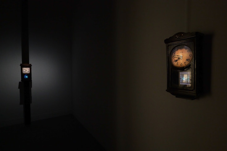 暗い展示室の柱や壁には、12の古い柱時計がかかっているが柱時計の針は「逆さ」に回転しており、振り子のあった部分には「逆さごと」の風習を解釈した映像が埋め込まれている。「死者が出た家の火を煮炊きに使わない」「使者の枕元に魂の拠り所として花を1本置く」といった12の風習が、時計のなかに刻まれた。現代における葬送のあり方の画一性に疑問を感じたという岡は、古来あったはずの多様な死への価値観を、いまいちど本作を通して提示している。