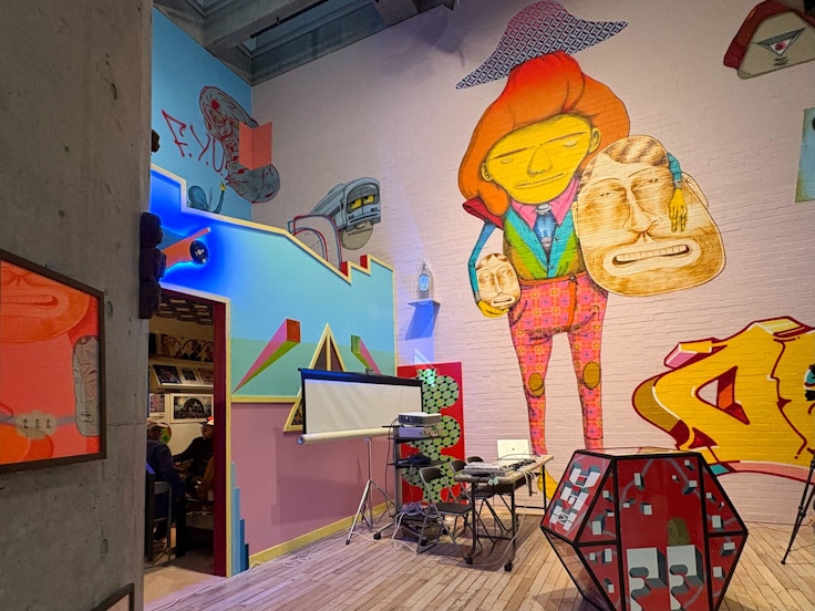 同館内の各フロアで多数の作品が展開されているが、まず目に飛び込んでくるのは2階にある大きな壁画だ。同館の特徴である巨大な壁が、2組のアーティストによる作品で埋め尽くされている。壁の中央に描かれたキャラクターはオスジェメオスによるもので、その両脇に抱えられるように描かれた2つの顔はバリーが描いたもの。コラボレーション方法は事前に決められてはおらず、約10日前に会場入りした2組が、まさにその場で即興的に生み出していった作品ばかりだ。本作もそのひとつである。