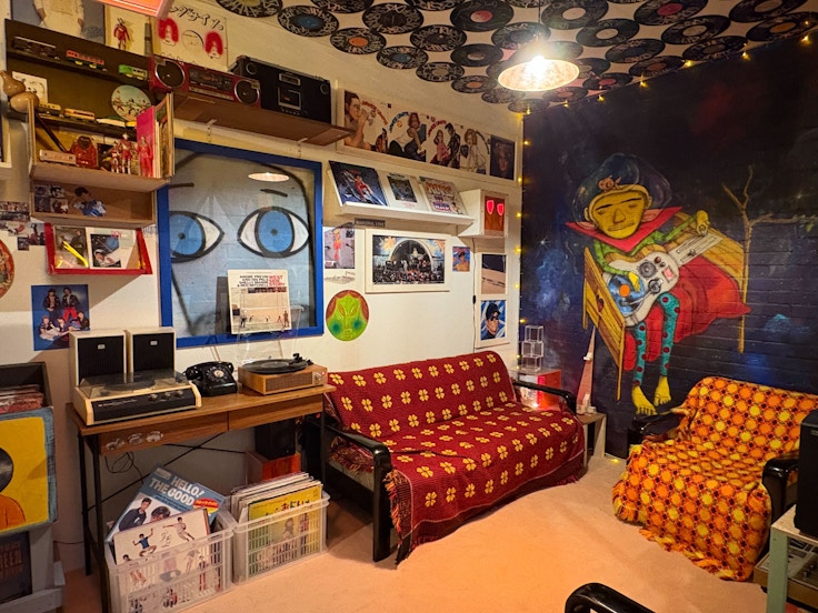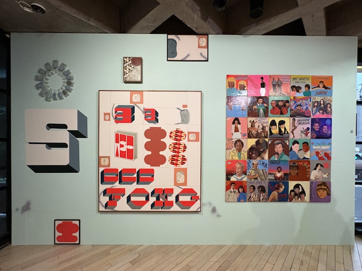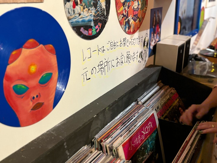 同じく2階の一角には、街の一部としてレコードショップのインスタレーションが登場。 2組の作品は音楽との強い結びつきがあることから制作された作品だ。本作は企画段階から構想されていたもので、ショップを模した空間のなかに並べられているレコードの一部は、日本のフリーマーケットをまわって集めたものだという。会期中、来場者は自分の好きなレコードを選び、その場で音楽をかけることもできる(ただし持ち帰りは厳禁)。