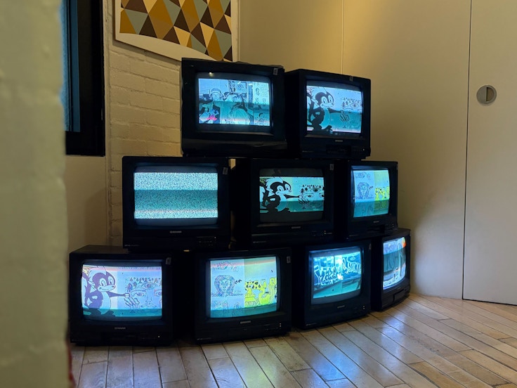 続いて3階には平面作品やブラウン管テレビを用いた作品が展開される。本フロアに展示されているのは、基本的にバリーの作品となっている。窓からは、2階から見上げた壁画を別の角度から見ることができるため、また違った印象を受けるとともに、その大きさに改めて驚かされる。