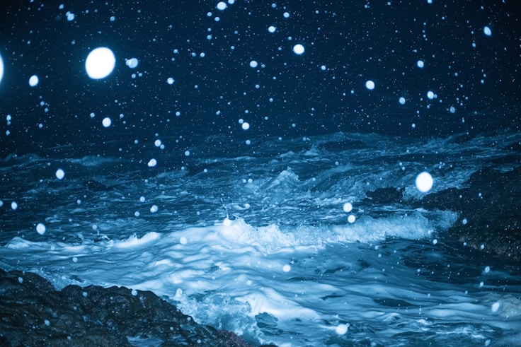そして、その過程で見出したのが「褜(えな)」だ。胎児と母体をつなぐ「へその緒」や胎盤のことで、地域によっては儀礼などに用いられるも、字は常用漢字からも外れ、忘れられつつある。出産時、まれに胎児にへその緒が首に絡みついていることがあり、死産や身体的な障害を負う危険性がある。この地方では、生死の境をさまよって生まれたこうした子供に、褜を仏の傘と見立て災いを福に転じさせるため、褜の字を名に付ける風習があったそうだ。現在もこの名を持つ男女が十数名いるという。志賀は、この「褜がらみ」をひとつの象徴として、見えないものが見える「内海褜男」という架空の存在が語りだす物語を、空間いっぱいの高さ4.2メートルの巨大な写真絵巻に仕立てた。