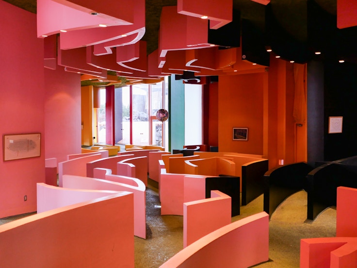 会場に足を踏み入れ、観客がまず向かったのは、evalaによるサウンドインスタレーション《perennial》が設置された養老天命反転地オフィスだ。十二単の羽衣を思わせる色彩豊かな建物の内部は、繊細なサウンドに包まれている。24色の外壁色がすべて内部にも反映された不規則な空間で、光とサウンドが複雑に絡み合い、視覚と聴覚の境界が曖昧になっていく。