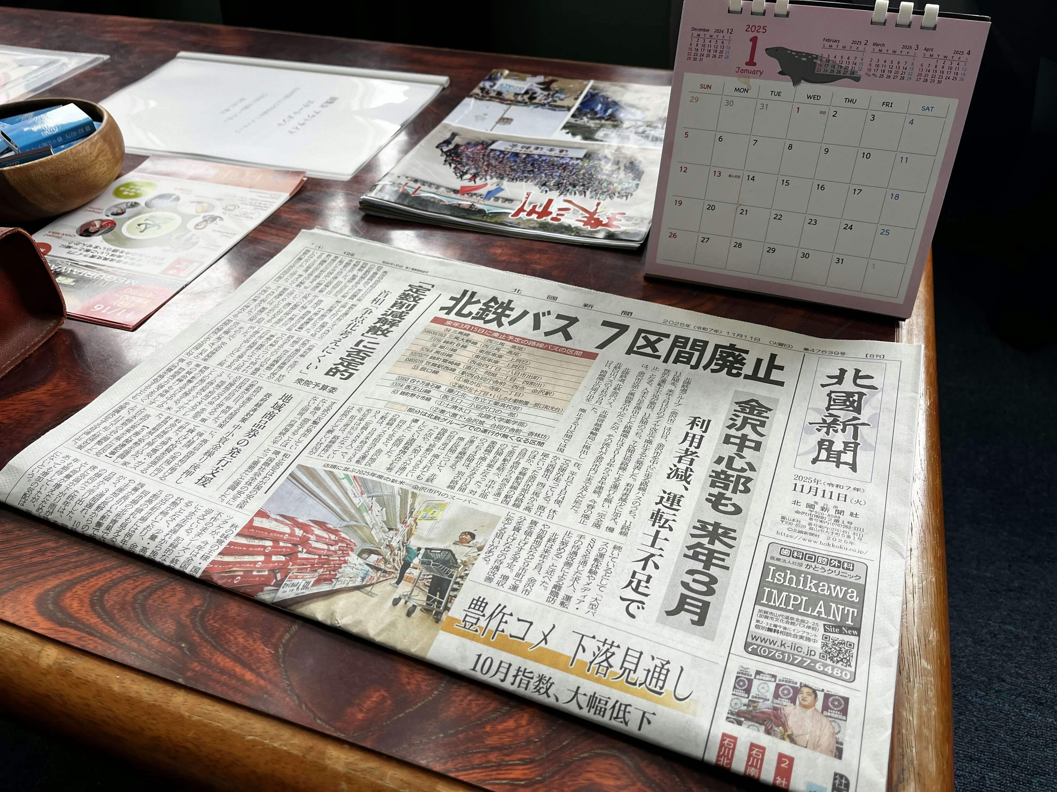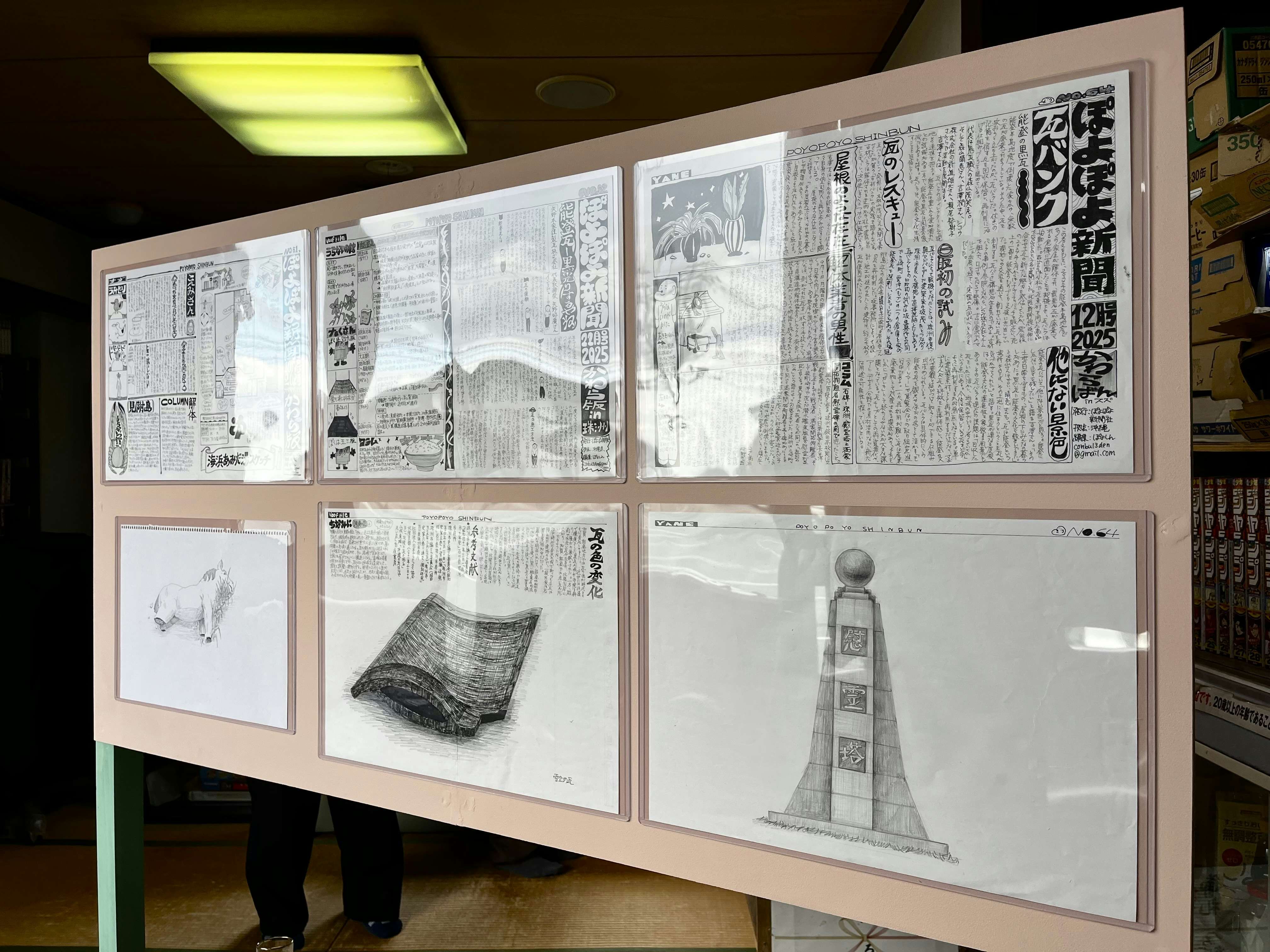 シンガーソングライターの七尾は、倒壊した建物から回収された能登瓦に、新作の詩「呼び声」を釉薬で記し、焼成した作品を発表している。静かでありながら、生々しい七尾の想いが伝わってくる 展示風景より、大和楓《ぽよぽよ新聞 瓦版 2025年10月号、11月号、12月号(原稿)》(2025)。能登瓦を題材に取材した内容を新聞形式でまとめている大和は、地域の産業史を丹念にひもときながら、時代考証的な視点を通して現代社会の構造まで浮かび上がらせている 展示風景より、池田杏莉《それぞれのかたりて / あしたも おはよう》(2025)。震災後、池田は自身も輪島を中心にボランティアに参加し、被災者との対話を重ねてきた。本作では、能登瓦の破片と、和紙にエッチングで描いたドローイングをひとつに組み合わせ、新たな立体作品として再構築している。和紙の褪色とともにドローイングが徐々に現れてくるという、時間の経過が作品のなかに組み込まれている点も特徴だ 展示風景より、仮( )-かりかっこ-《仮(切籠)》(2025)。「あみだ湯」を経営する新谷健太と、ゲストハウスを運営する楓大海によるアーティストコレクティブは、様々な集落から集めた部材を組み合わせ、祭りで使われる「キリコ」を制作した。現在、あみだ湯では被災家屋の木材を燃料として用い、街を弔いながら癒しを提供している 展示風景より、宮崎竜成《物質と記憶》(2025) 写真提供=作家