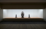 規制の多い設えの仕様など、不自由は多い。そんななか、紙でつくられた畳や屋久杉を用いて免震機能を備えた台座を一から設計。そして黒漆喰を施した壁で空間を仕切って展示ガラスの存在を限りなく消すというシンプルな解決法により、作品と鑑賞者の距離を、時間的にも空間的にも一気に縮めることに成功した。鑑賞者は漆黒の闇の中で、中世・近世の人々の眼差しと息遣いを、古物を介して追体験することができるのだ。それは杉本の写真作品を前にしたときに味わう感覚とも通じるものがある。古美術蒐集家であり、建築家であり写真家である杉本でこそ実現しえた空間であると言えよう。