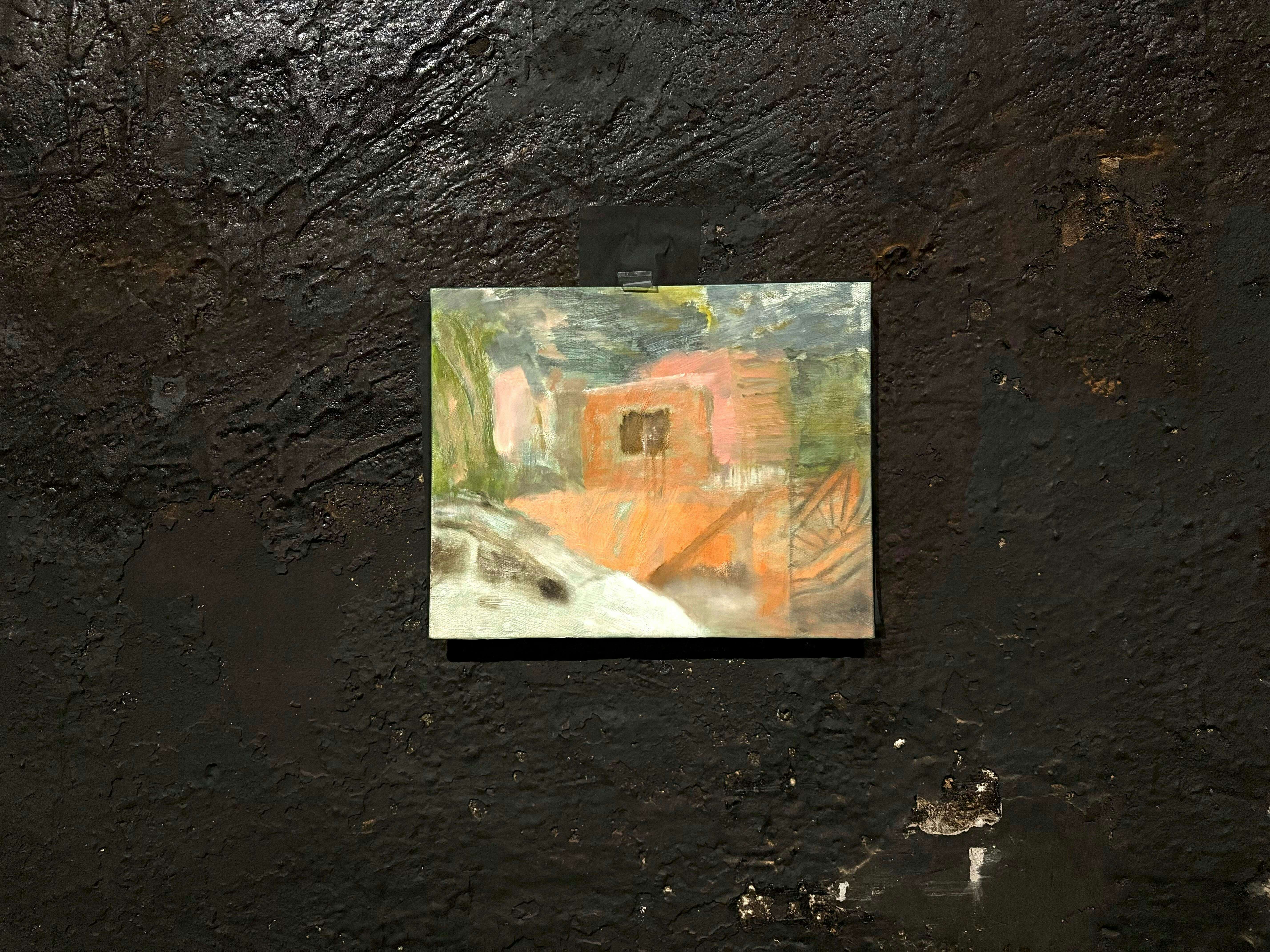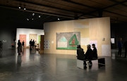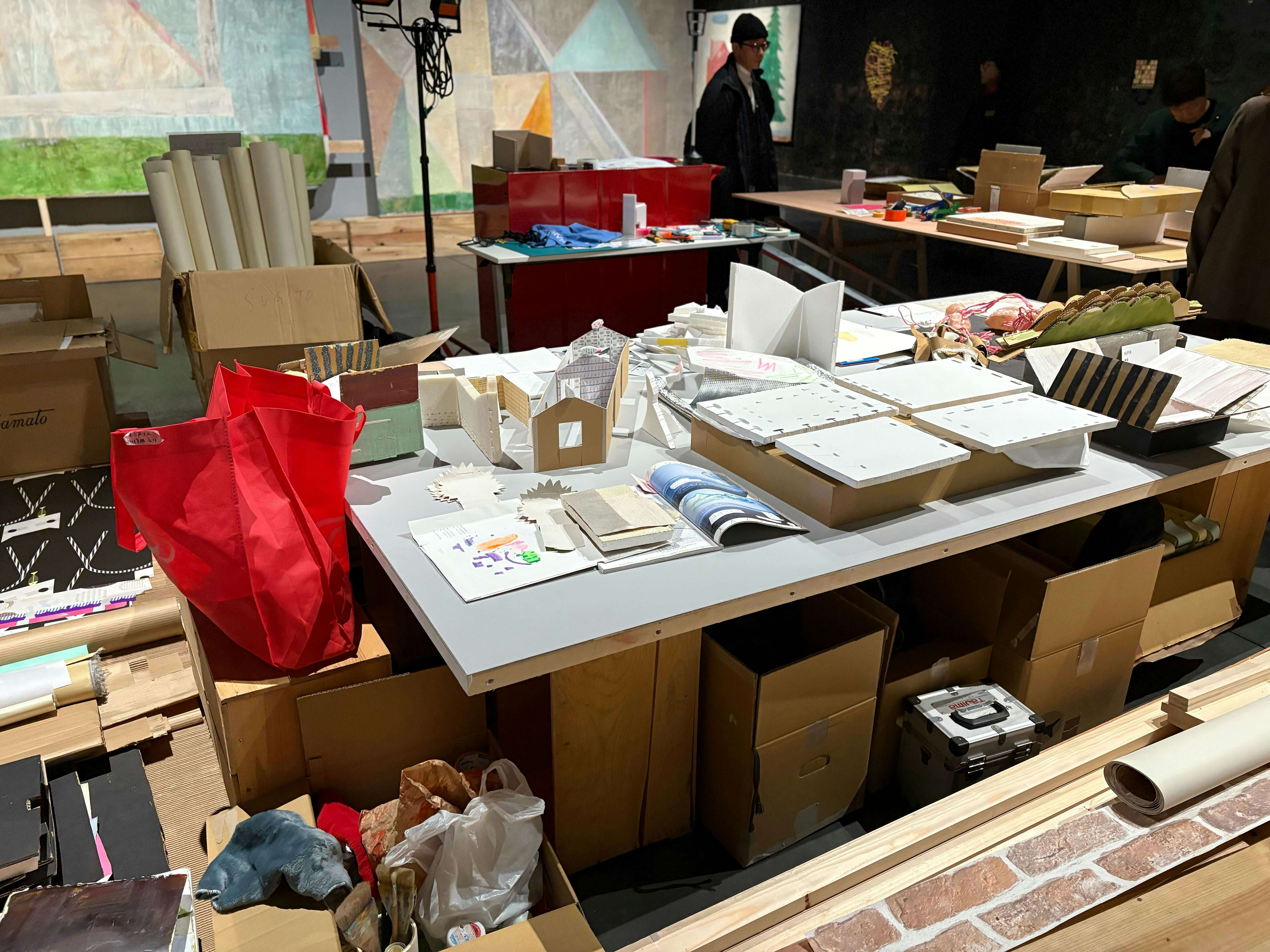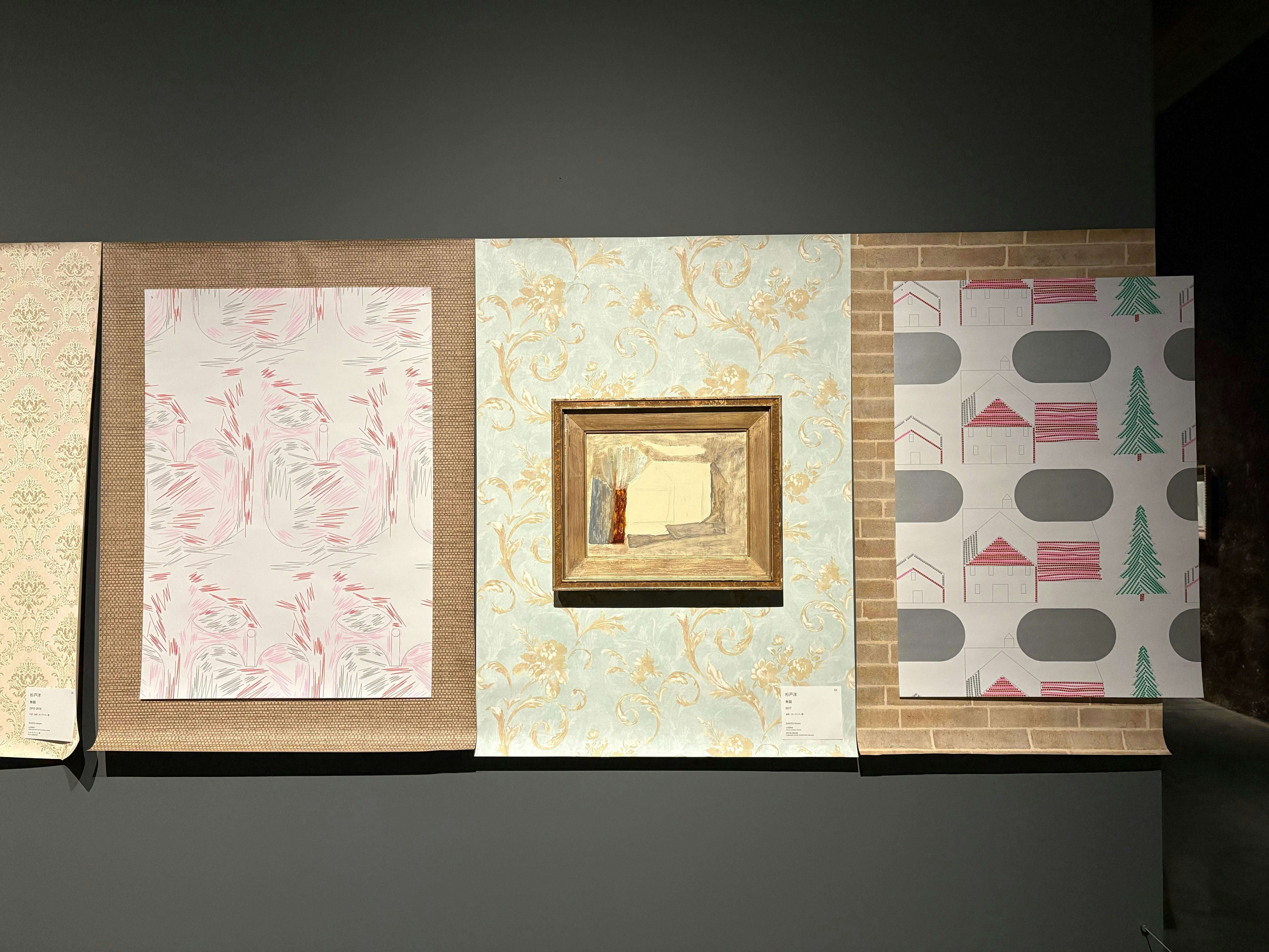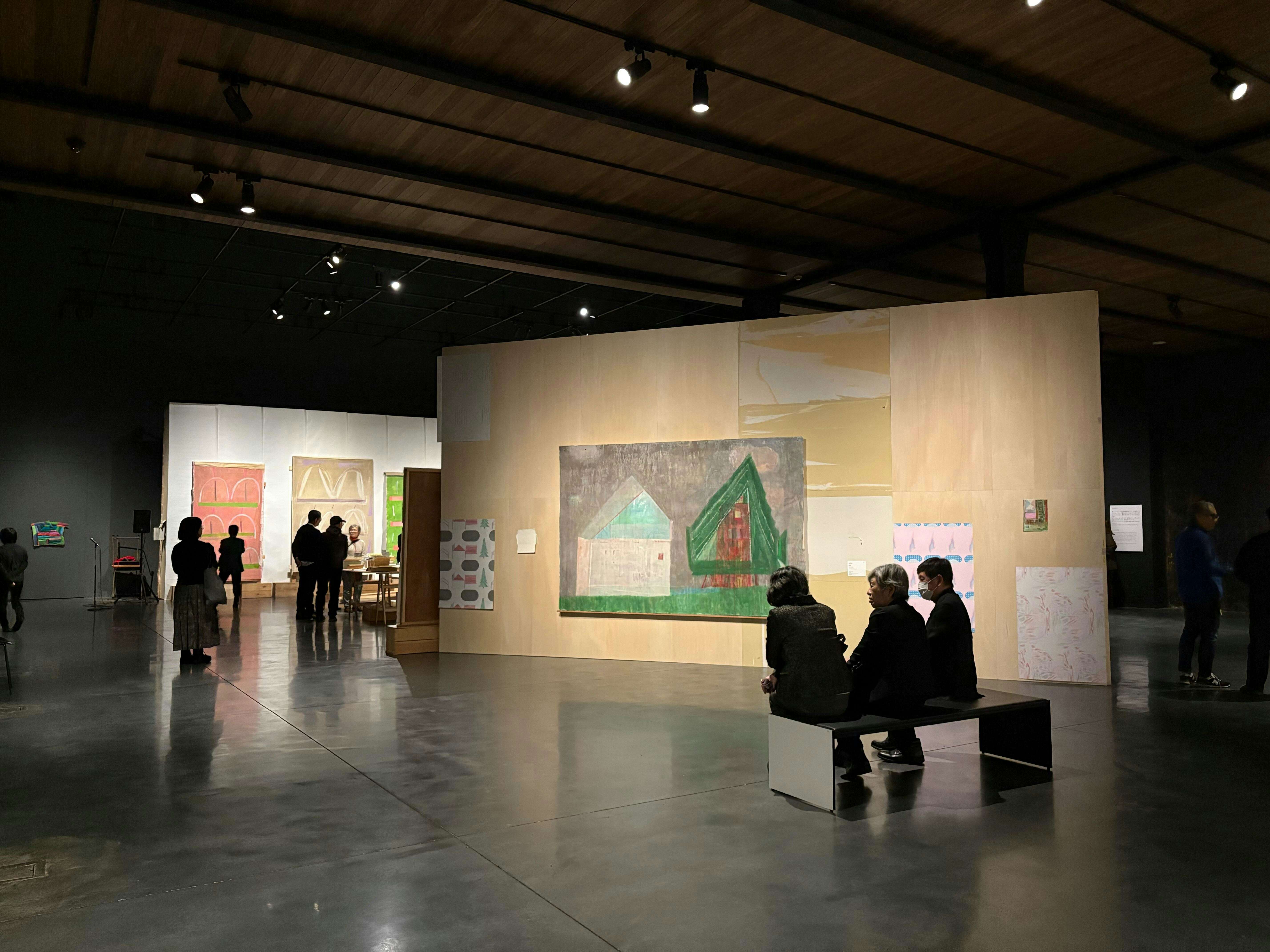 本展は明確な章立ては行われておらず、大きく2つにわかれた展示空間を広く使って展開されている。入ってすぐの空間中央には、ひとつの小屋が建っている。小屋の外側は木材そのままが見える状態だが、中に入るとカラフルな壁紙に覆われた空間が現れる。