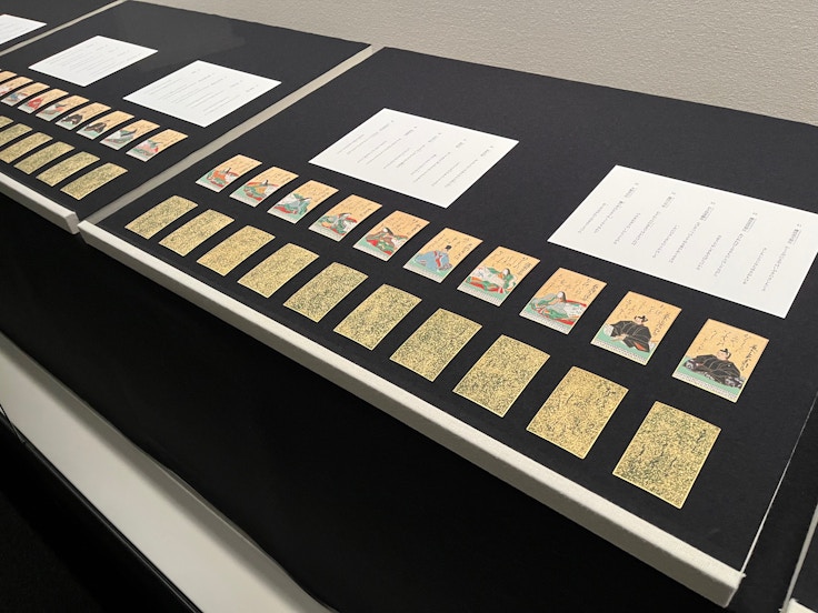 また、本展では百人一首や歌仙を題材にした「かるた」も見どころとなっている。山口素絢が絵を、鈴木内匠が文字を担当した《百人一首かるた》(18〜19世紀、江戸時代)は絵札と文字札をすべて展示。また、団扇形が珍しい《三十六歌仙扇形かるた》(18〜19世紀、江戸時代)にも注目だ。