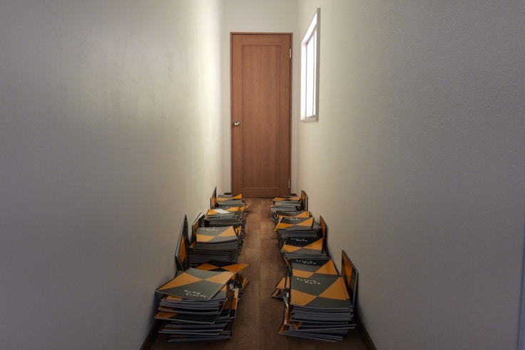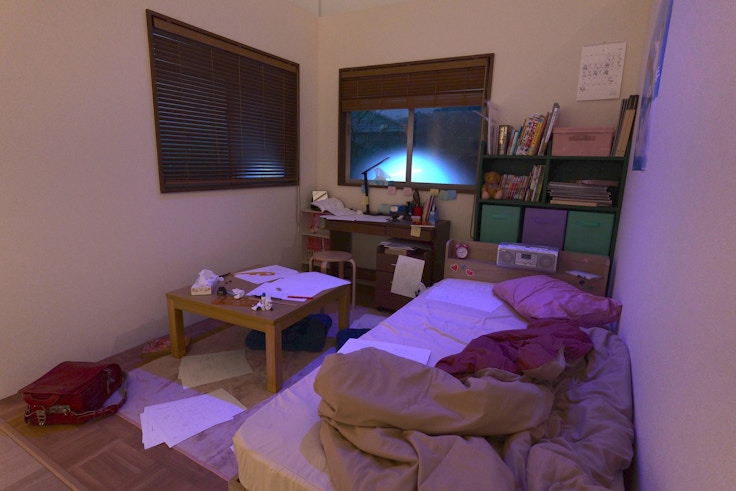 4「京本家の廊下」は、作中の京本の部屋へと進む廊下を再現した展示だ。ドアの外にはスケッチブックが積み重なり、廊下の向こうで絵を描き続ける京本と、その存在によって再び絵の道を歩もうとする藤野が工作する場が表現されている。