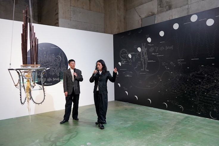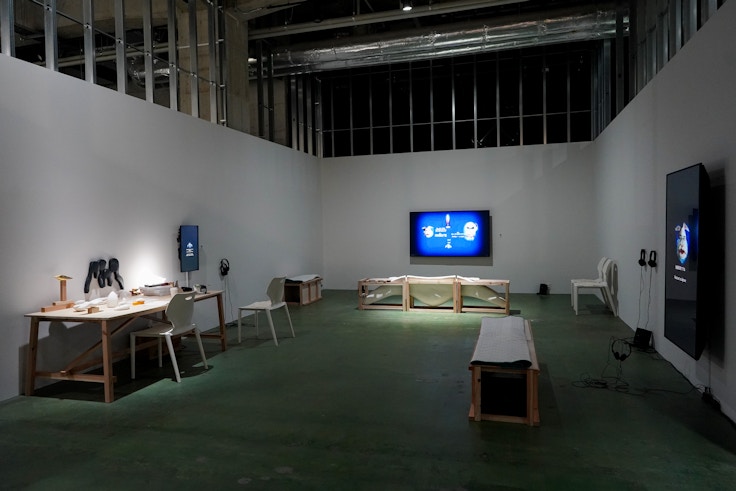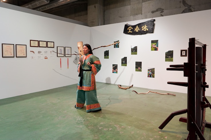 鷲田めるろ賞を受賞した小林勇輝は、中国南部の武術「詠春拳」を起点とした学際的パフォーマンス作品を展開。詠春拳は約300年以上前に少林寺の女性僧侶・拳法家によって創始され、国共内戦と日中戦争により佛山から香港に亡命した祖師「葉問」とその弟子たちによって世界に広まった。小林は2019年以降、香港・中国・日本にて鍛錬やリサーチ、交流を重ねてきたという。壁面には映像や資料が展示され、小林は会期中、毎日この場所で公開稽古を行う。