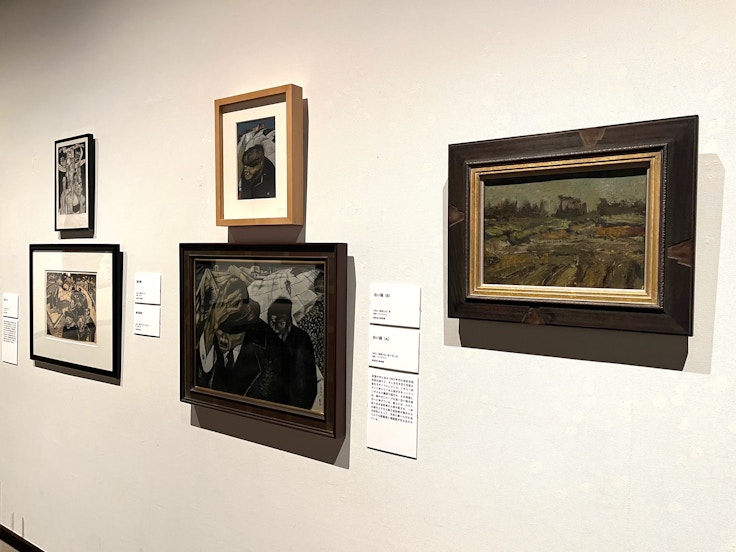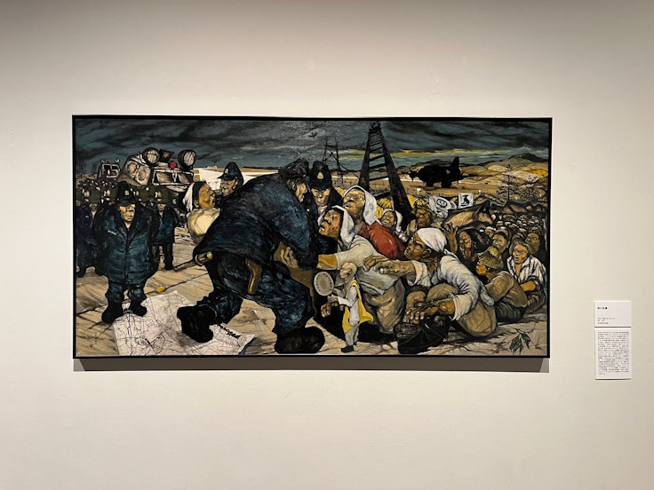 第1章「社会へのまなざし」では、中村の初期作品を展示しつつ、美術という手段を用いながらいかに政治運動へと参画していたのかを振り返る。1951年に上京して日本大学芸術学部へ入学した中村は、前衛美術を通して政治運動へと関わっていく。中村は政治や社会を文学的手法で伝えるルポルタージュを絵画に取り入れ、社会主義リアリズムとはまた異なった「ルポルタージュ絵画」を制作していった。