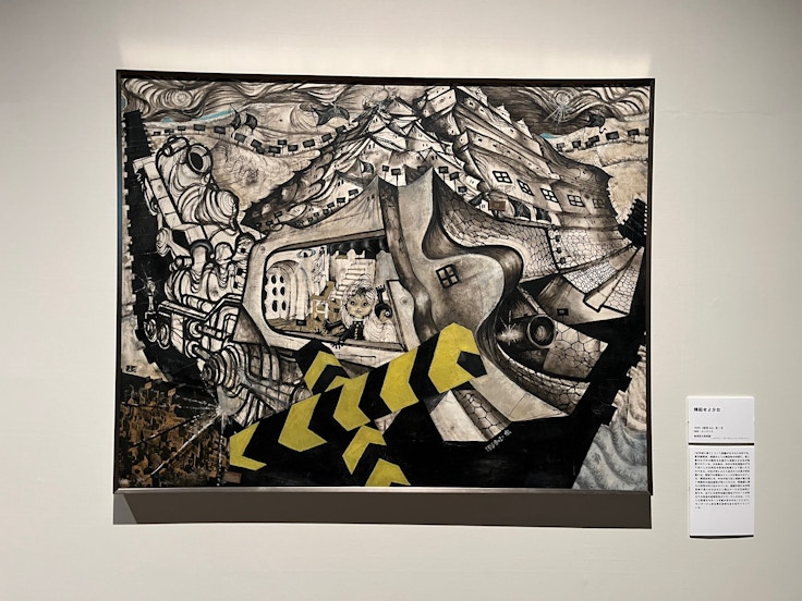 以降の中村は、夏の積乱雲、蒸気機関車の車窓、そして戦争といった幼い日の記憶を、かつて《木枯らしー三方原》(1951)で描かれたような故郷・浜松の三方原台地のだだ広い風景と呼応させながら、観念的な構成によって平面上に表現するようになる。