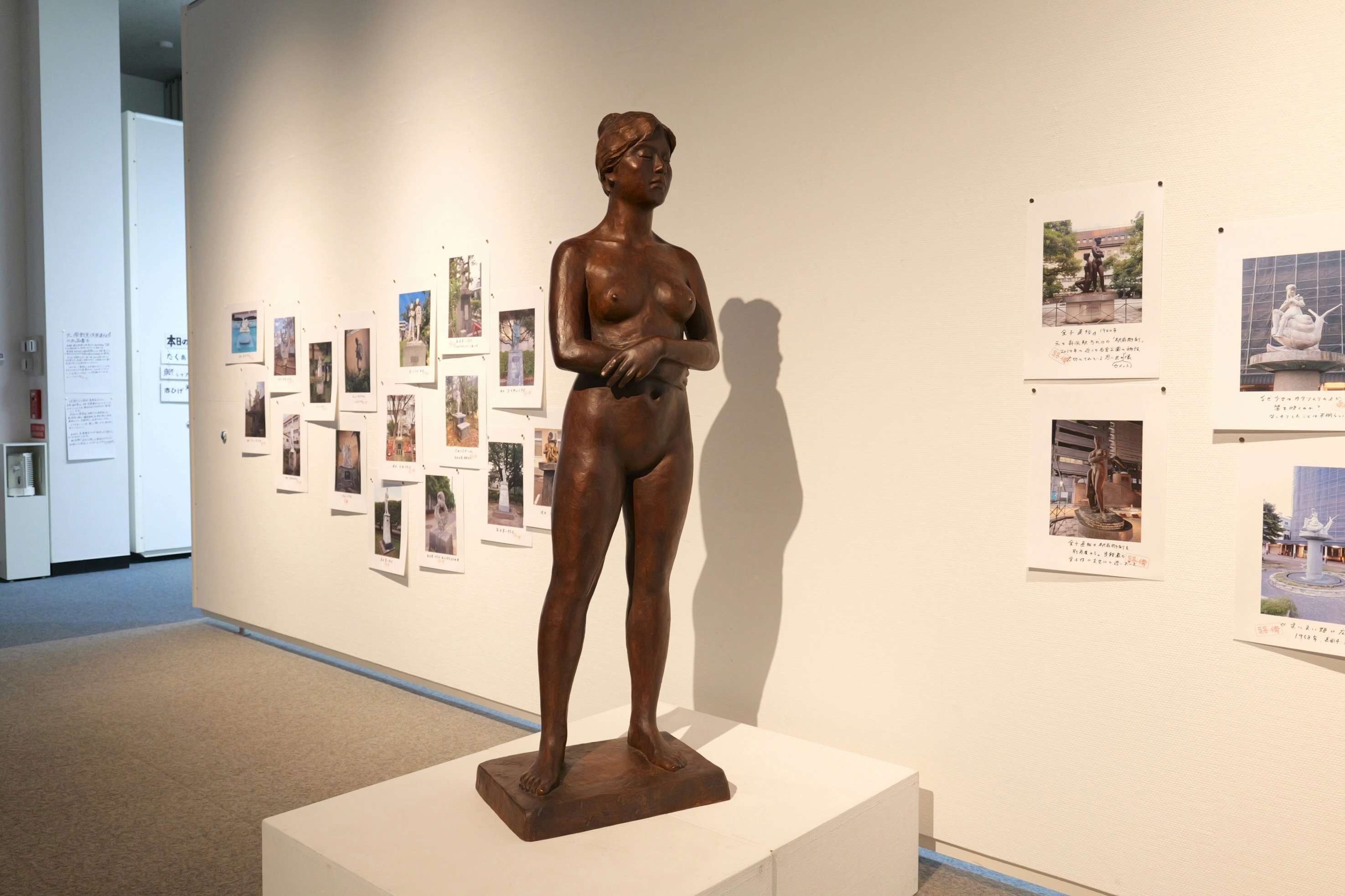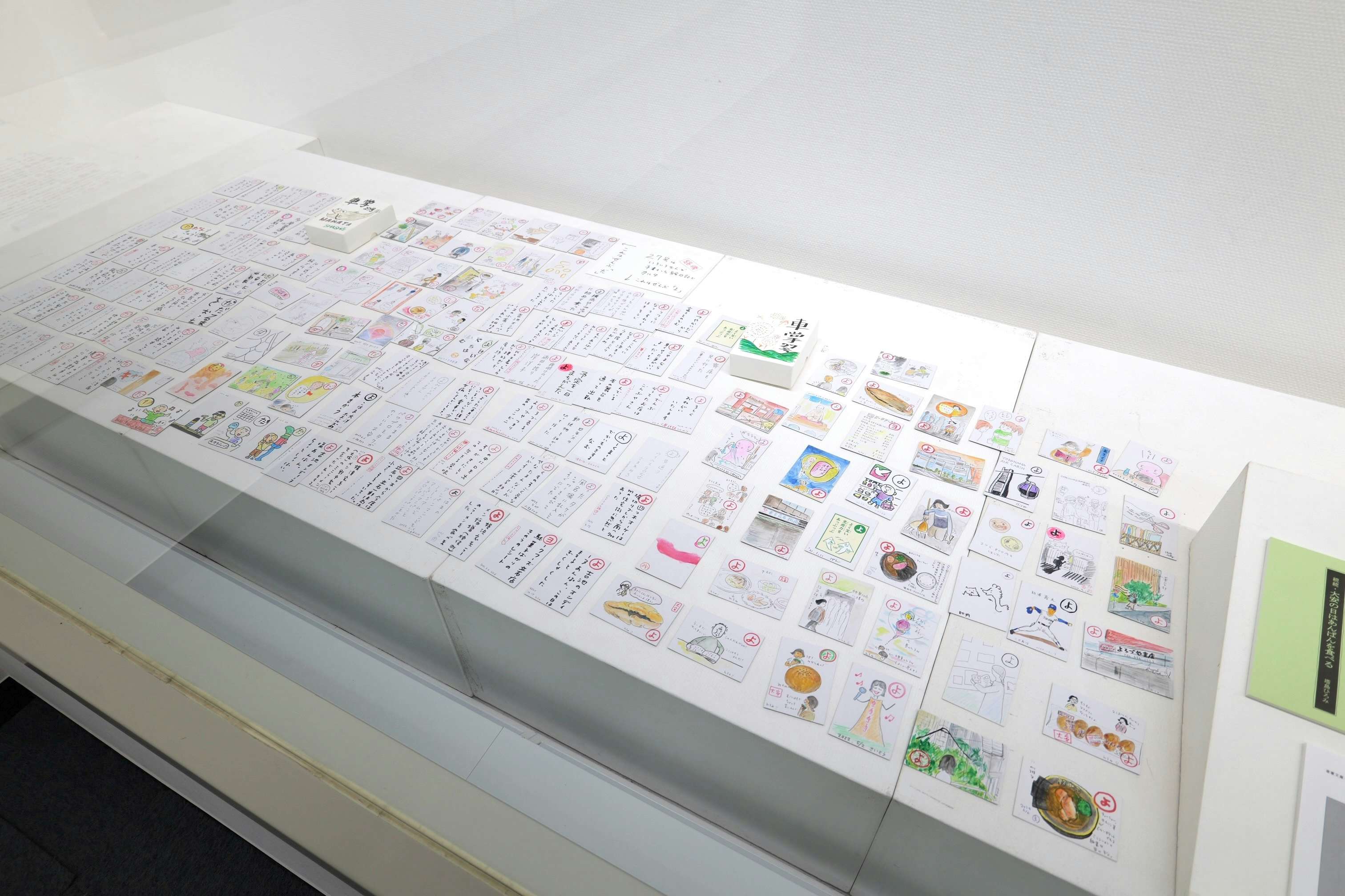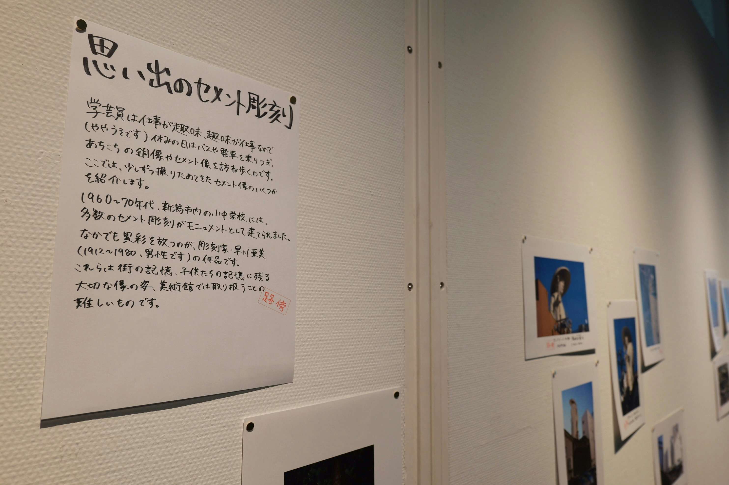 本展は担当の藤井の手描きによる解説文が様々なところに散りばめられている。いずれもA4の紙にサインペンで書かれており、「路傍」のスタンプが押され、画鋲でパネルに止められているのが特徴だ。その言葉は展示の解説をしつつも、どこか独り言のようでもあり、また考えの途上をメモしているようにも感じられ、本展が構成された思考の流れを追いかけることができるようになっている。
