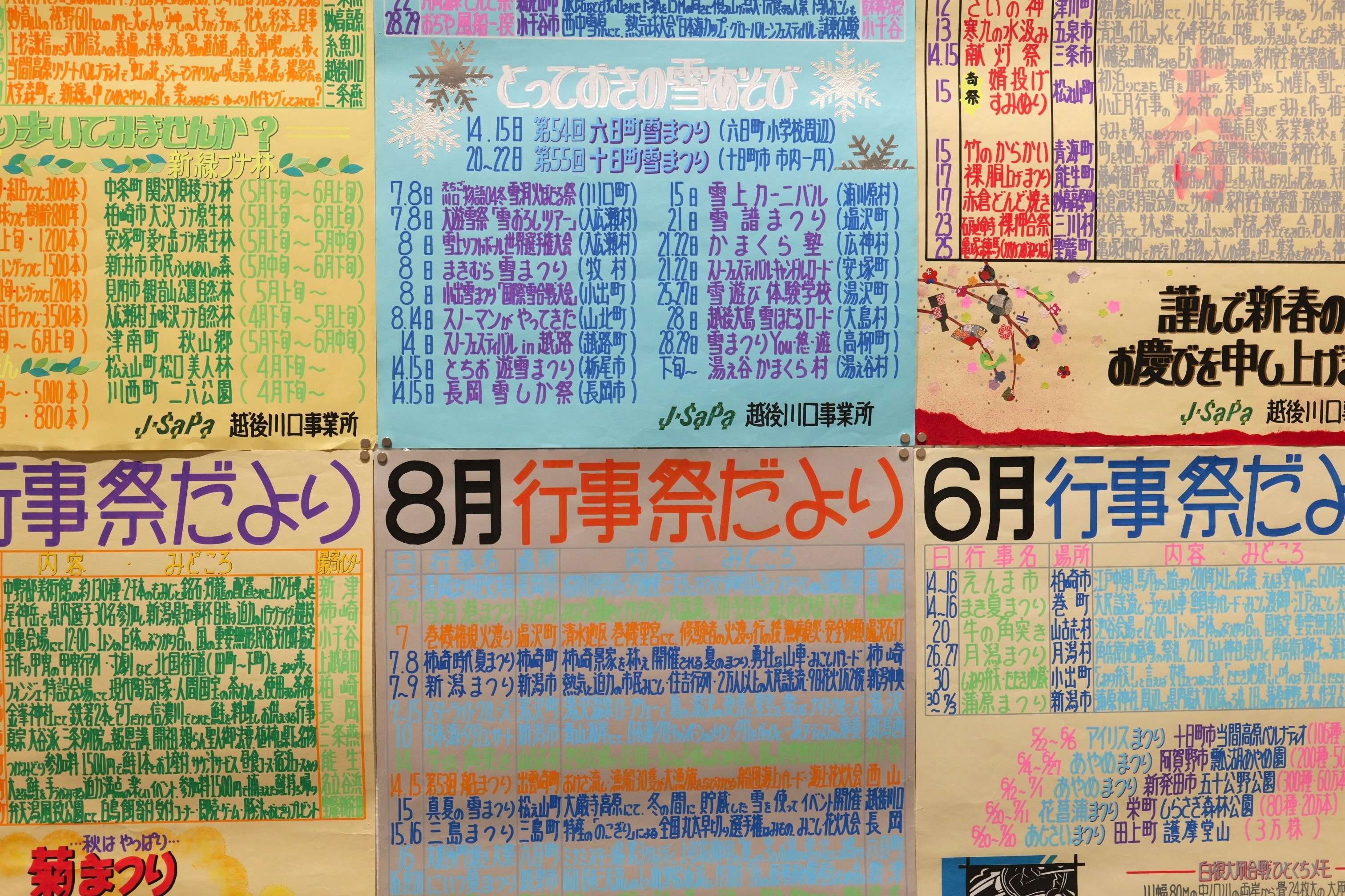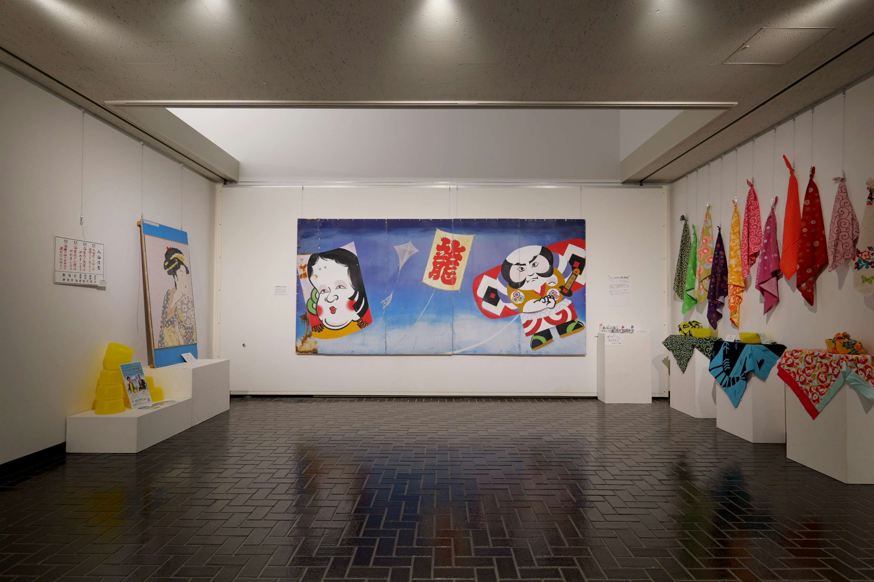 展覧会はまず「にいがた銭湯展」から始まる。本展は「にいがた銭湯大使」に任命されている、お笑いコンビ・ジャックポットの大野まさやと春巻まさしがゲストキューレーターを務めた。新潟市の各所にある様々な銭湯を、時代の変遷とともにきえていったものも含めて写真やイラストで紹介するほか、銭湯の装飾に使われる表現についても注目。上古町にある「菊の湯」で浴室に飾られており、休業時に新潟歴史博物館へ寄贈されたペンキ絵は、描き変える必要がないタイル絵に取って代わられて、いまや全国的にも希少な存在だ。いっぽうのタイル絵も業者が少なくなってきており、その鮮やかなモザイクアートの技術も失われつつある。ほかにものれんや衣類カゴ、「ケロリン」の桶など、新潟の銭湯の歴史と、そこに宿った小さな美学が紹介されている。