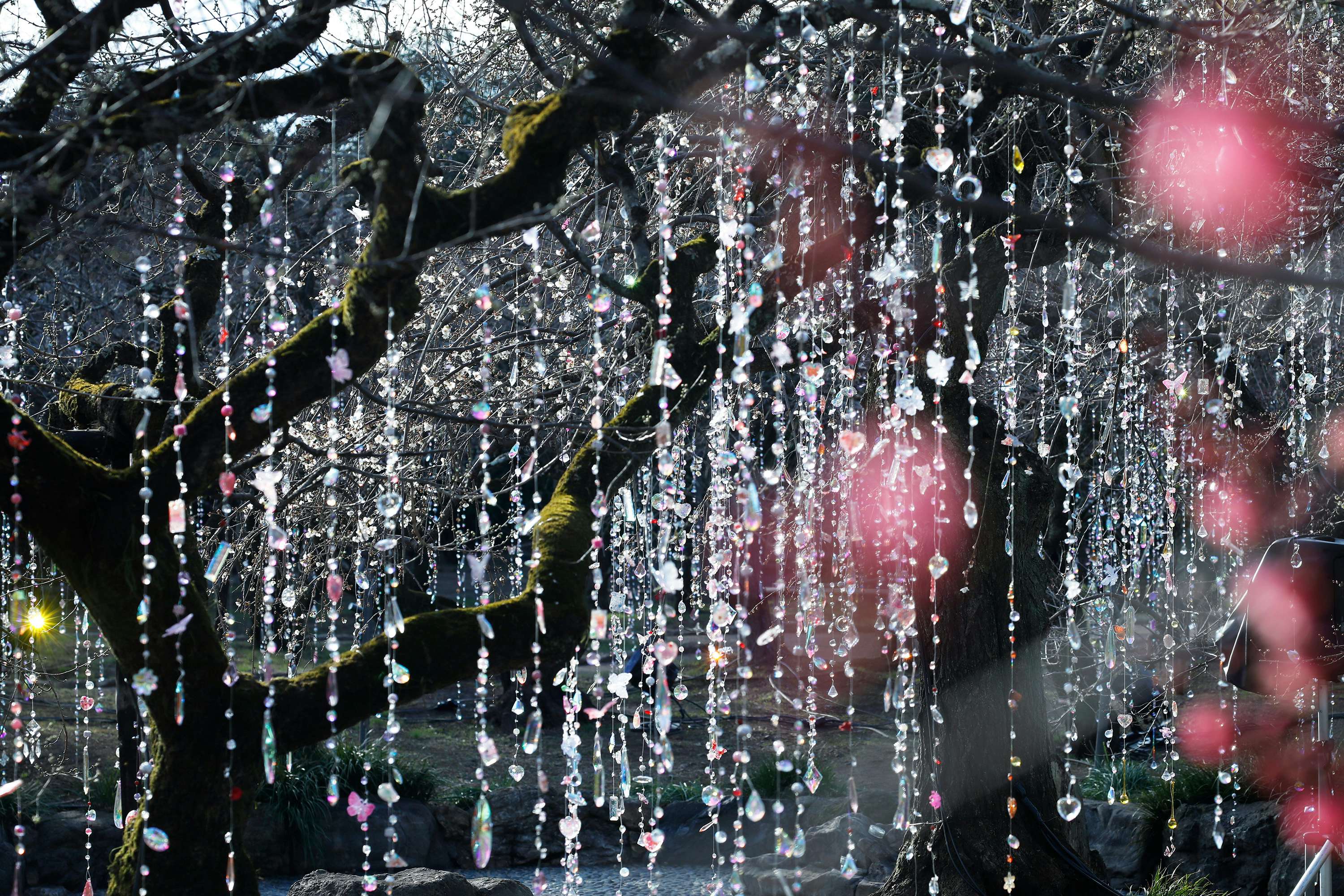 《光と花の庭》は、北野天満宮が祀る菅原道真が11歳のときに詠んだ漢詩「月夜見梅花」をコンセプトとしている。「輝く月は晴れた日の雪のよう」「咲き誇る梅は星のよう」と詠まれた情景が、そのまま立ち上がるかのような作品だ。梅苑の木々に吊るされた約1200本のクリスタルが、季節や時間帯によって表情を変え、目を向けるたびに異なる輝きを放つ。