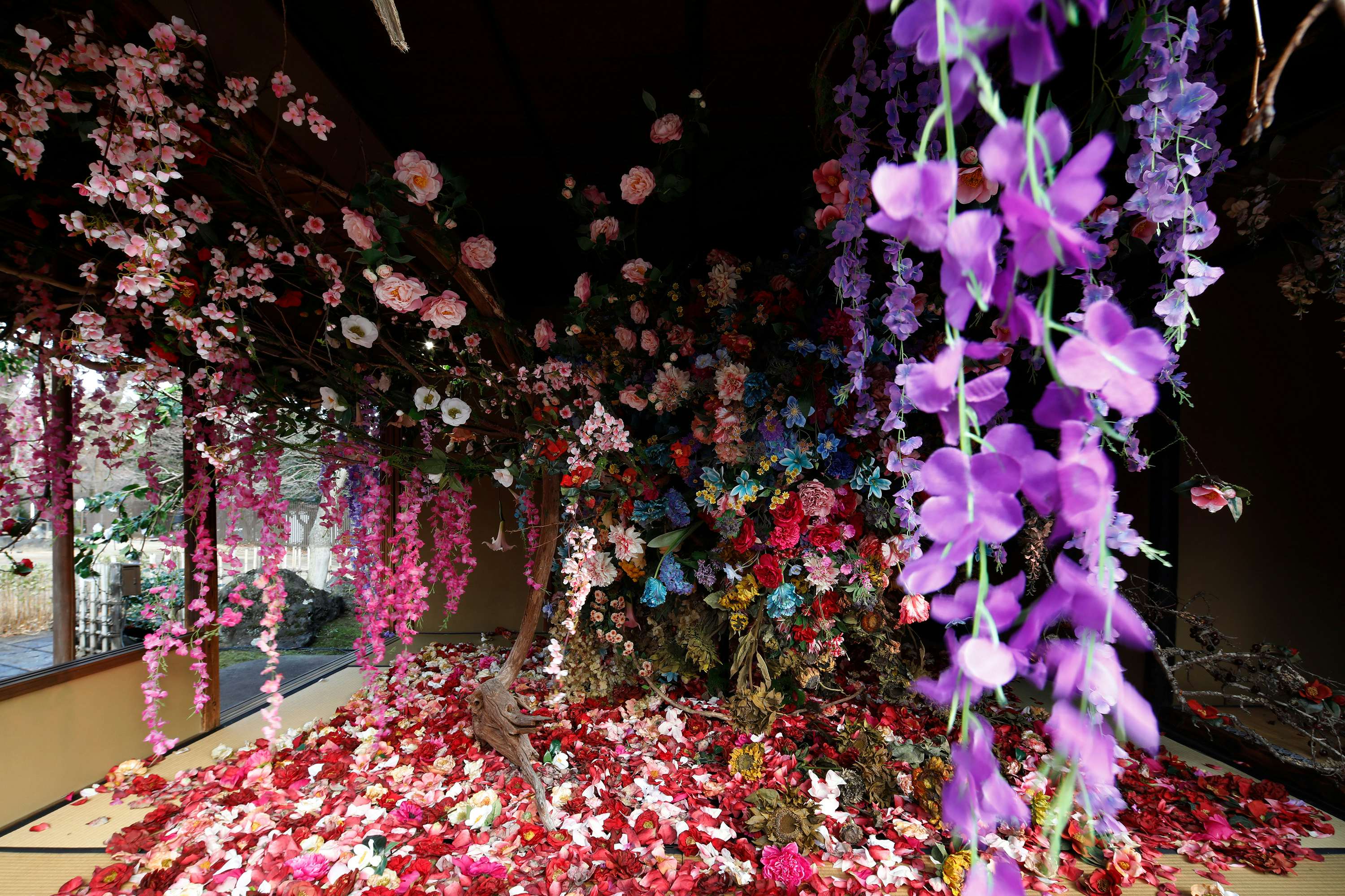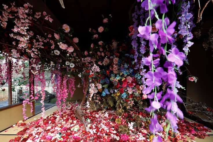 また、御土居 梅交軒に展示された《残照》は、蜷川がこれまでも手がけてきたシリーズの最新作だ。「場所の力も借りることができ、今回は最高傑作だと感じている」と蜷川は語る。咲き誇る花と枯れゆく花という対照的な状態が茶室空間に共存し、いのちの循環や時間の不可逆性を静かに示す構成となっている。