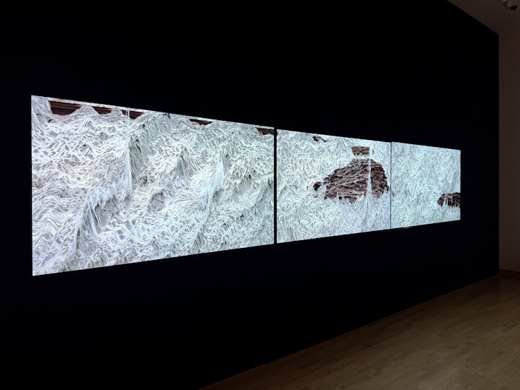 量子セクションを進んだ先で、時間そのものの感覚を静かに揺さぶるのが、古澤龍の映像作品《Mid Tide #3》(2024)である。千葉の海を同一地点から約3時間半にわたって撮影した映像を素材に、時間と空間の関係を組み替えた本作では、波の反復がたんなる潮の満ち引きの記録を超え、奥行き方向に「時間の層」が重なっていく光景として立ち現れる。固定された視点と一定の時間の流れという映像の前提が崩れることで、鑑賞者は、私たちが日常的に感じている時間とは異なるリズムに身を委ねることになる。