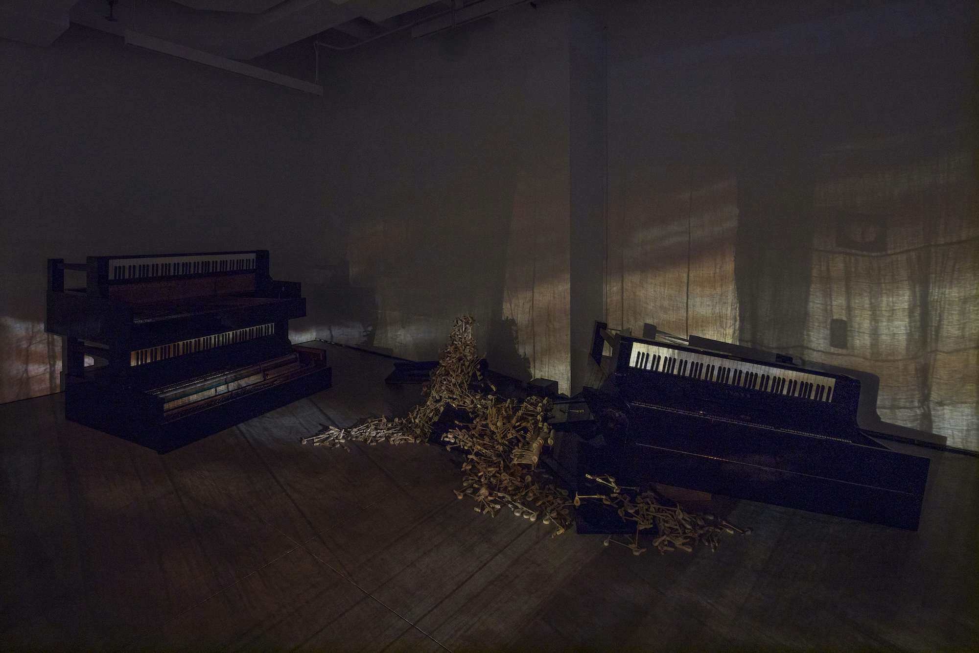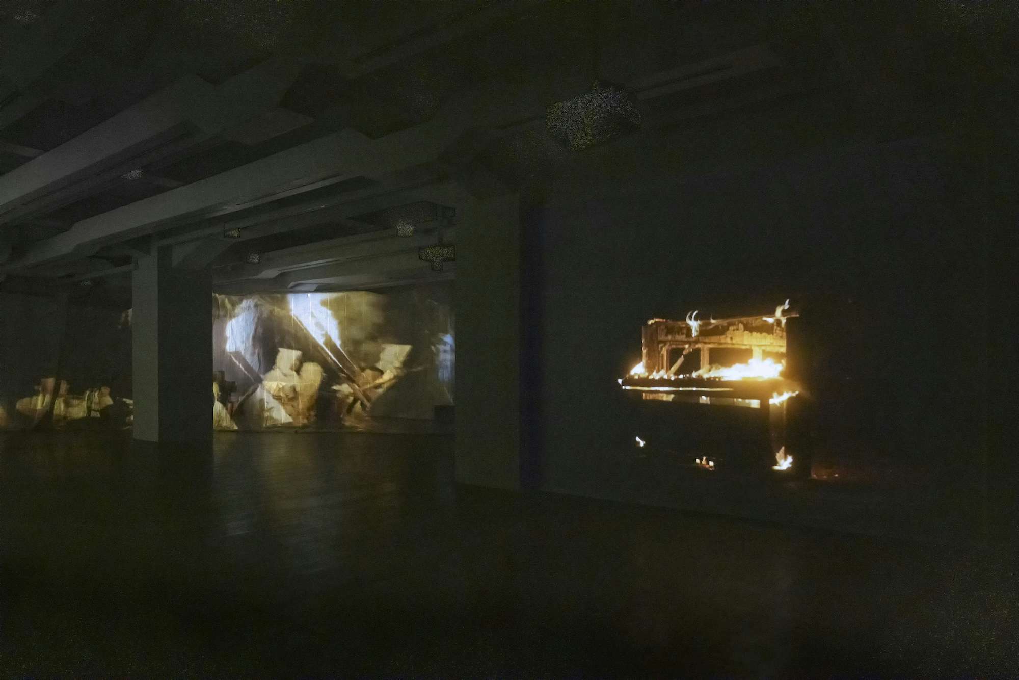 オランダ・アムステルダムを拠点とする向井山は、ピアノ、映像、パフォーマンス、インスタレーションといった既存のジャンルを越境する表現者だ。向井山にとって美術館での初の大規模個展となる本展。タイトルの「Act of Fire」には、作家の身体と記憶に根ざす喪失・抵抗・怒りを燃焼させる「儀礼」の意味が込められている。同時に、ジェンダーの不平等、深刻化する自然災害、終わりの見えない他国への侵略といった現代社会の諸問題を、「火」という根源的なメディアを通して照らし出すという意味も重ねている。