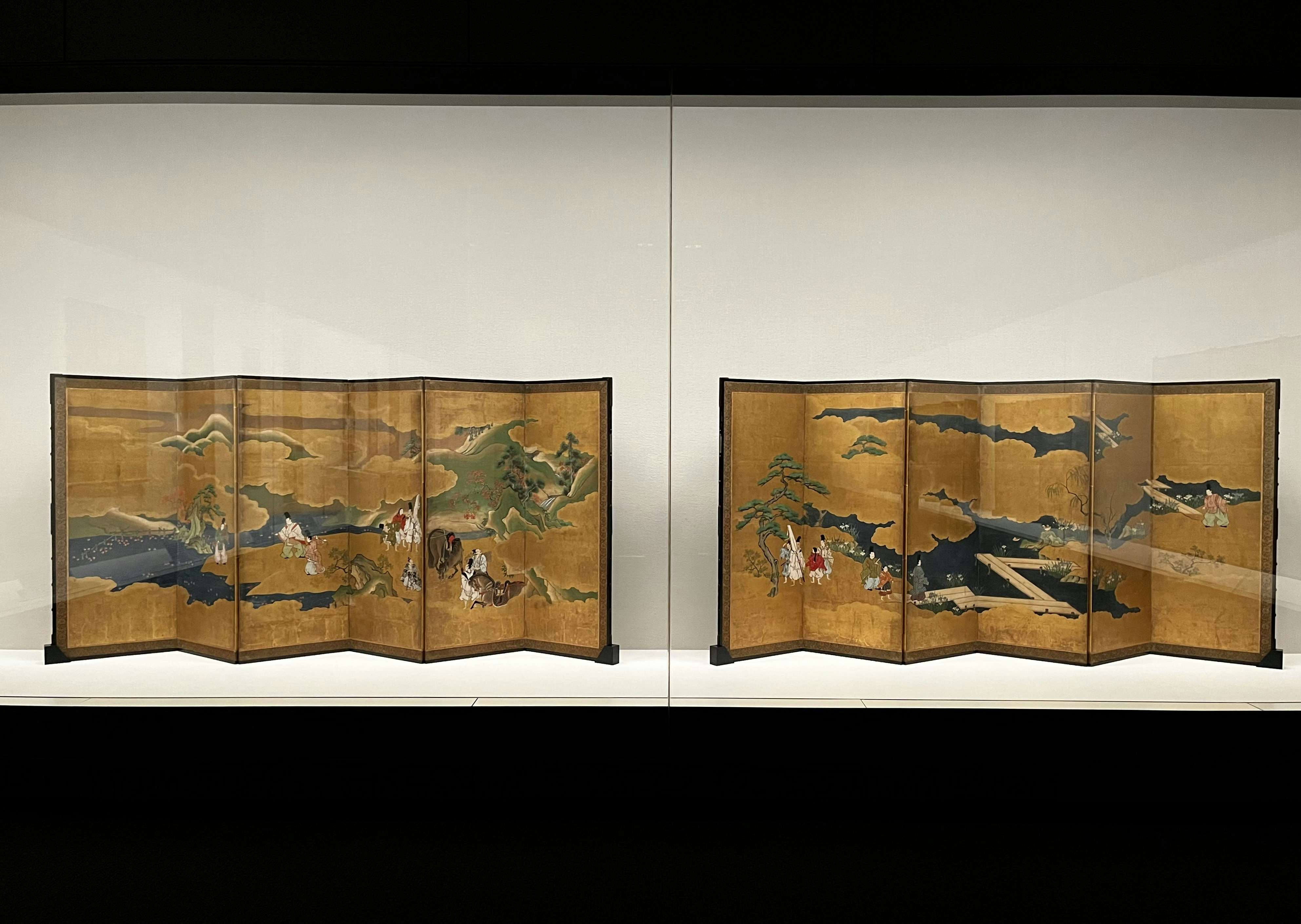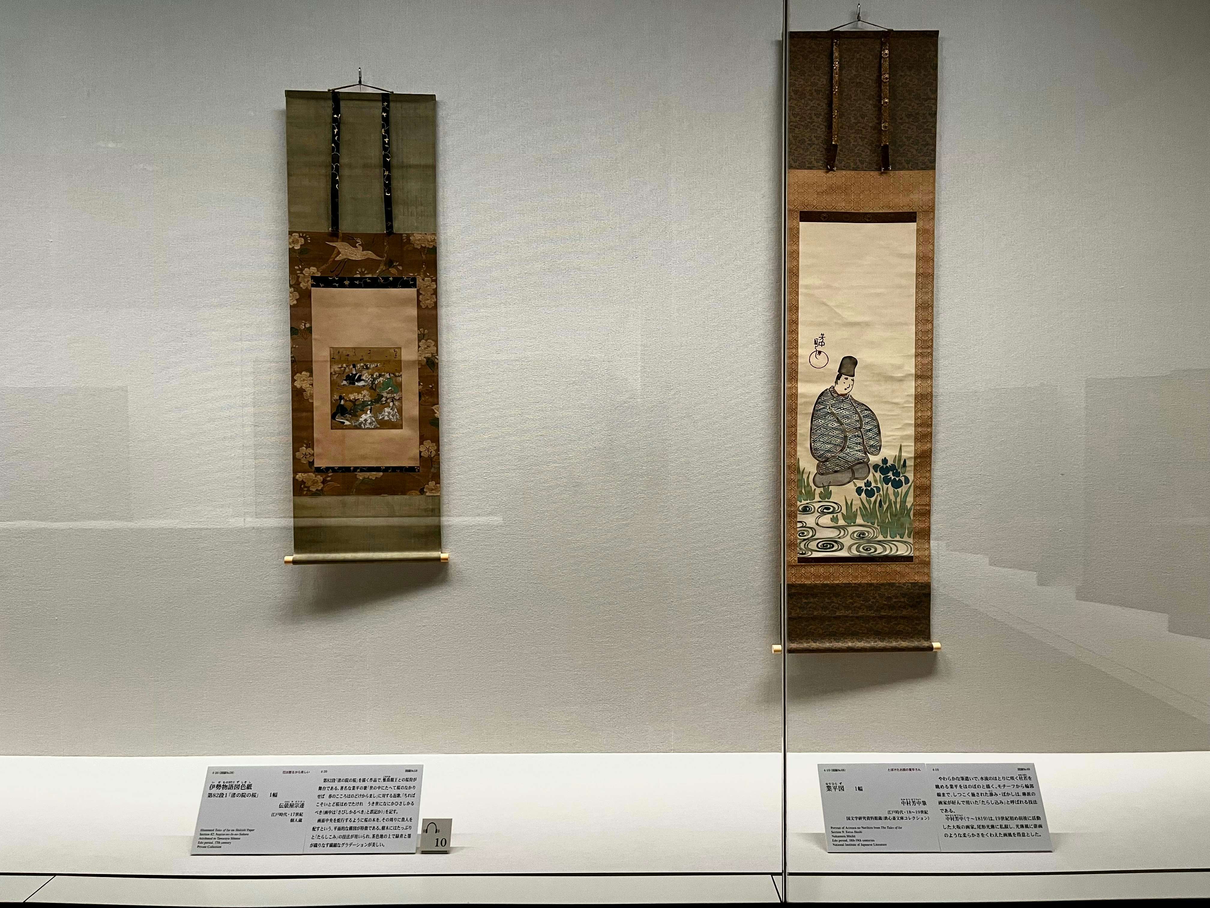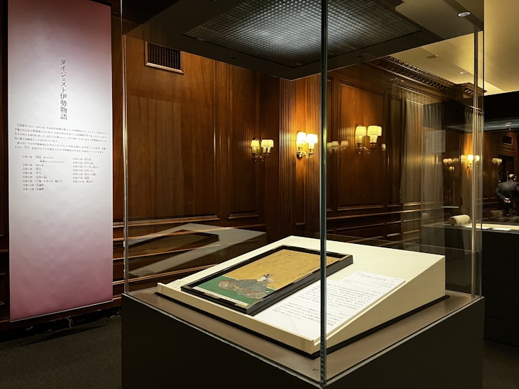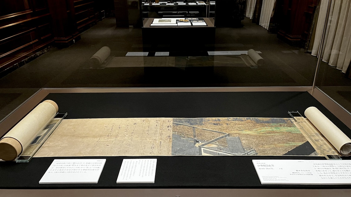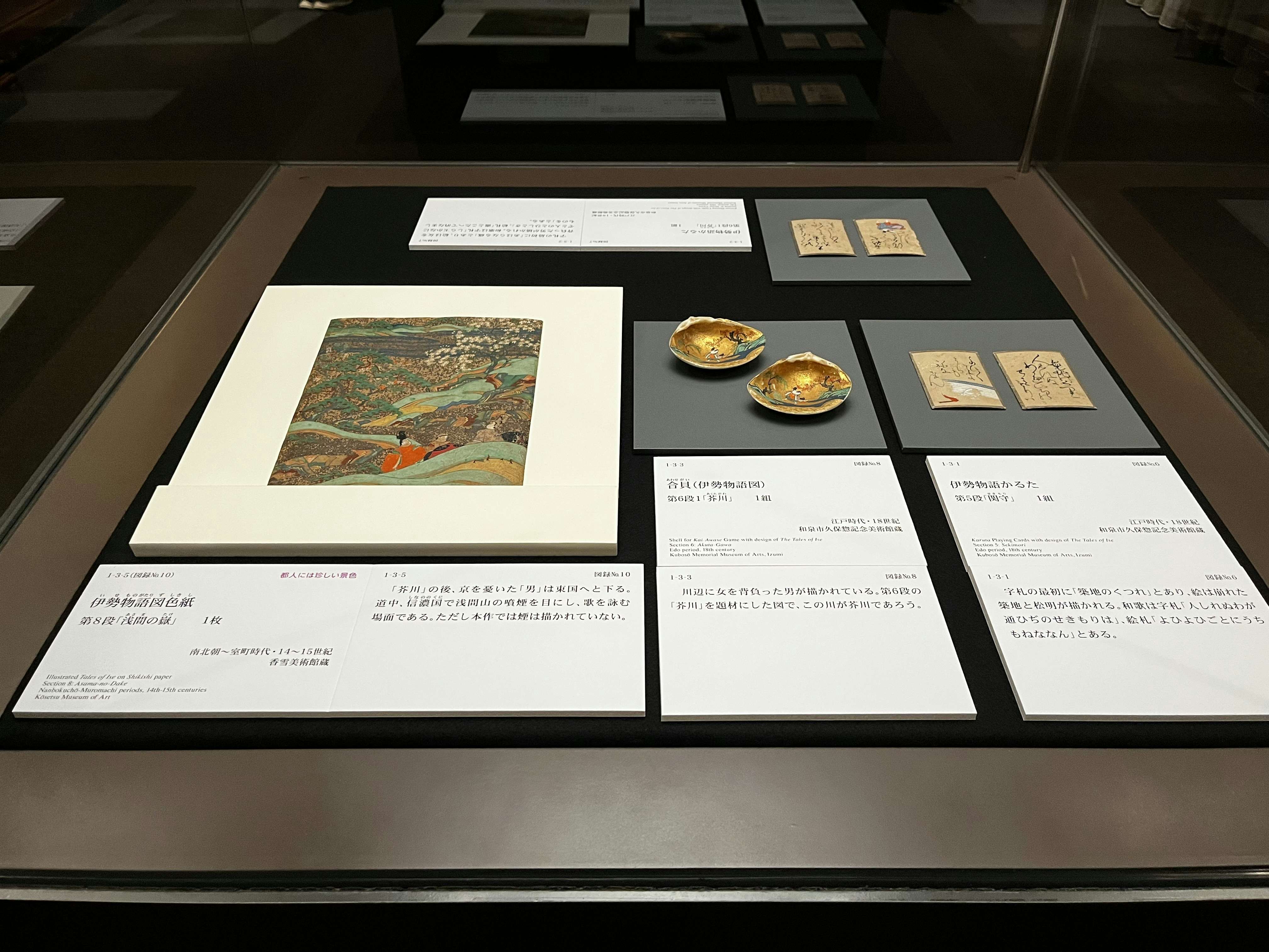 まず最初の展示室では、現存最古の彩色写本とされる重要文化財《伊勢物語絵巻 第4段「西の対」部分 1巻》(鎌倉時代・13~14世紀)をはじめ、全125段から成る『伊勢物語』の名場面を描いた絵巻・色紙・かるた・合貝(あわせがい)・茶道具などが並ぶ。これらを通じて、物語のあらすじをダイジェスト的にたどることが可能となっている。
