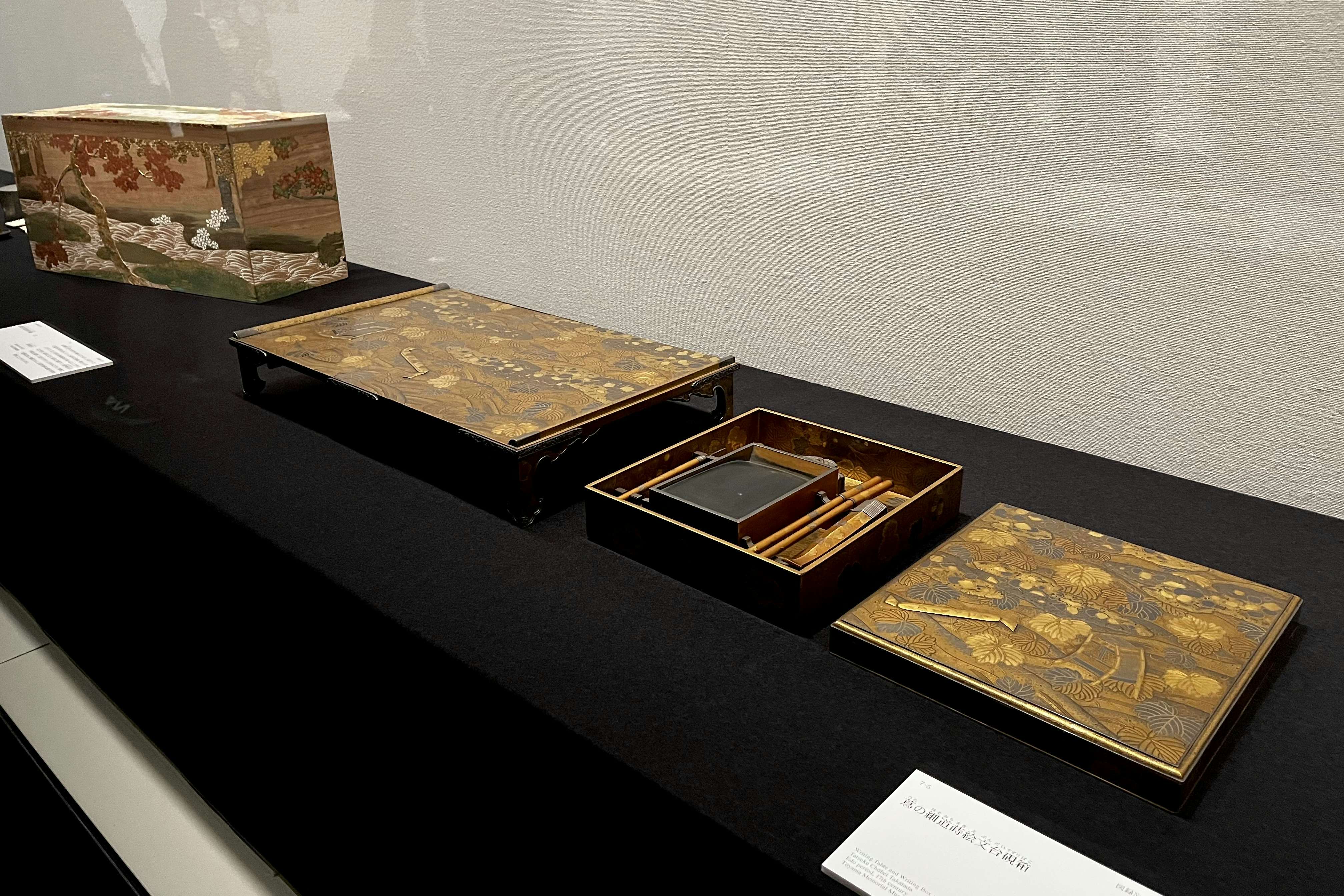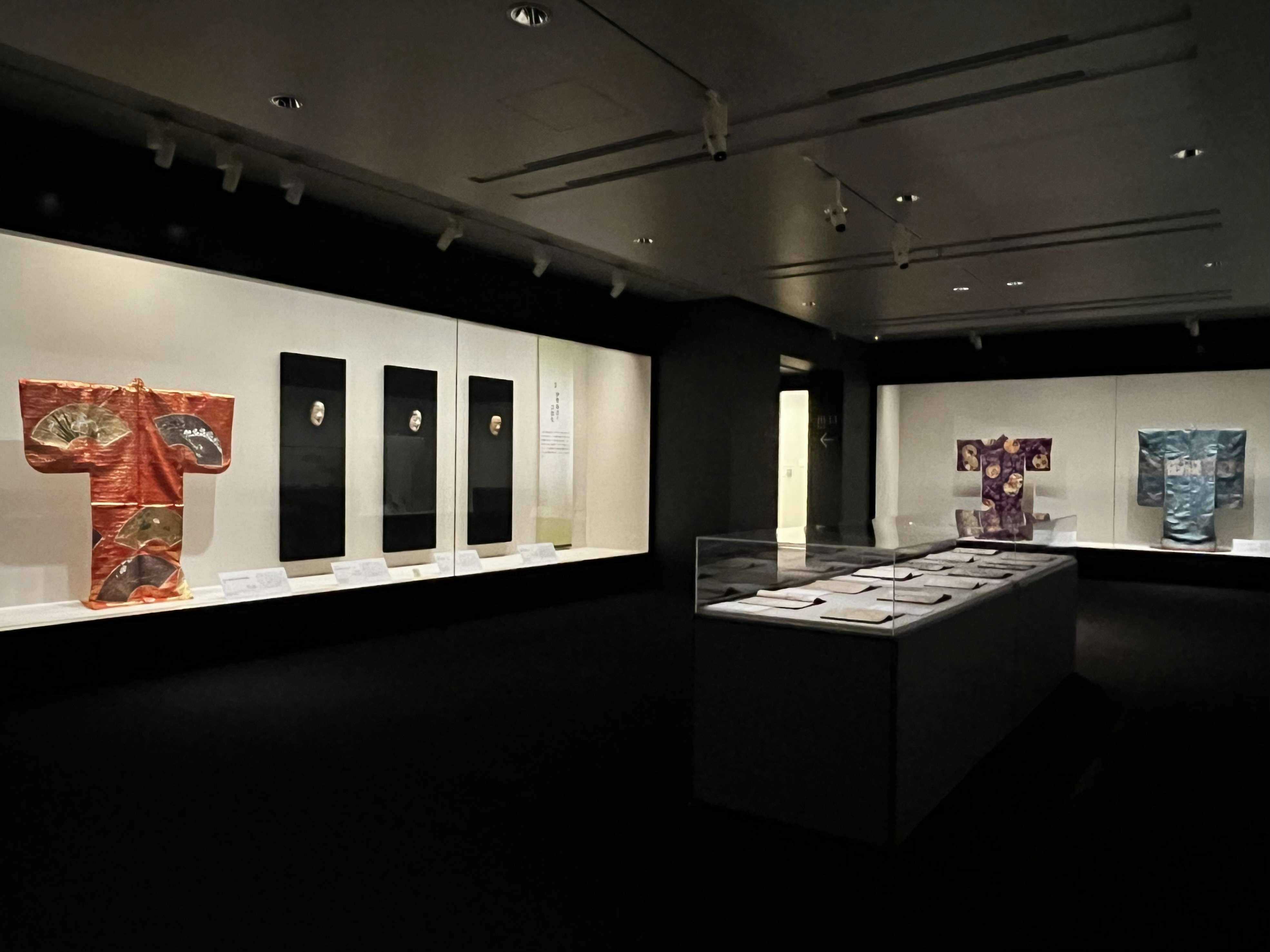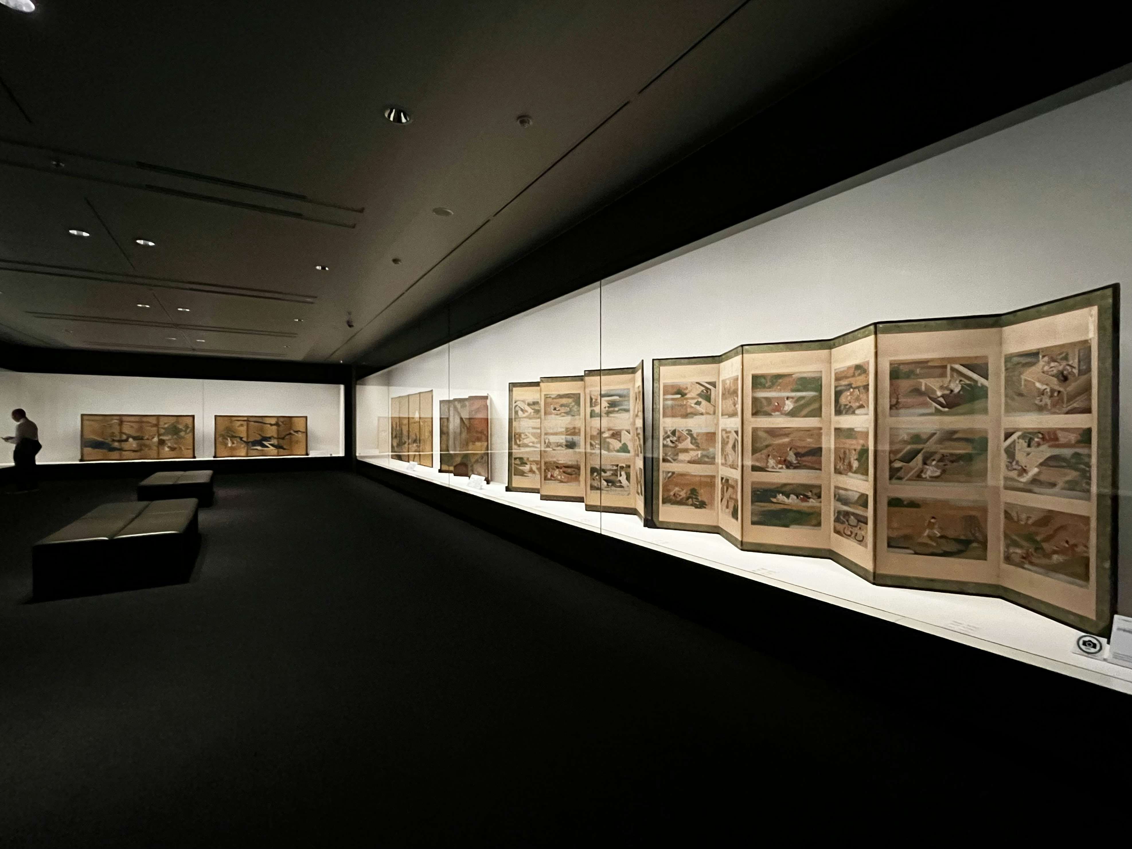 まず最初の展示室では、現存最古の彩色写本とされる重要文化財《伊勢物語絵巻 第4段「西の対」部分 1巻》(鎌倉時代・13~14世紀)をはじめ、全125段から成る『伊勢物語』の名場面を描いた絵巻・色紙・かるた・合貝(あわせがい)・茶道具などが並ぶ。これらを通じて、物語のあらすじをダイジェスト的にたどることが可能となっている。