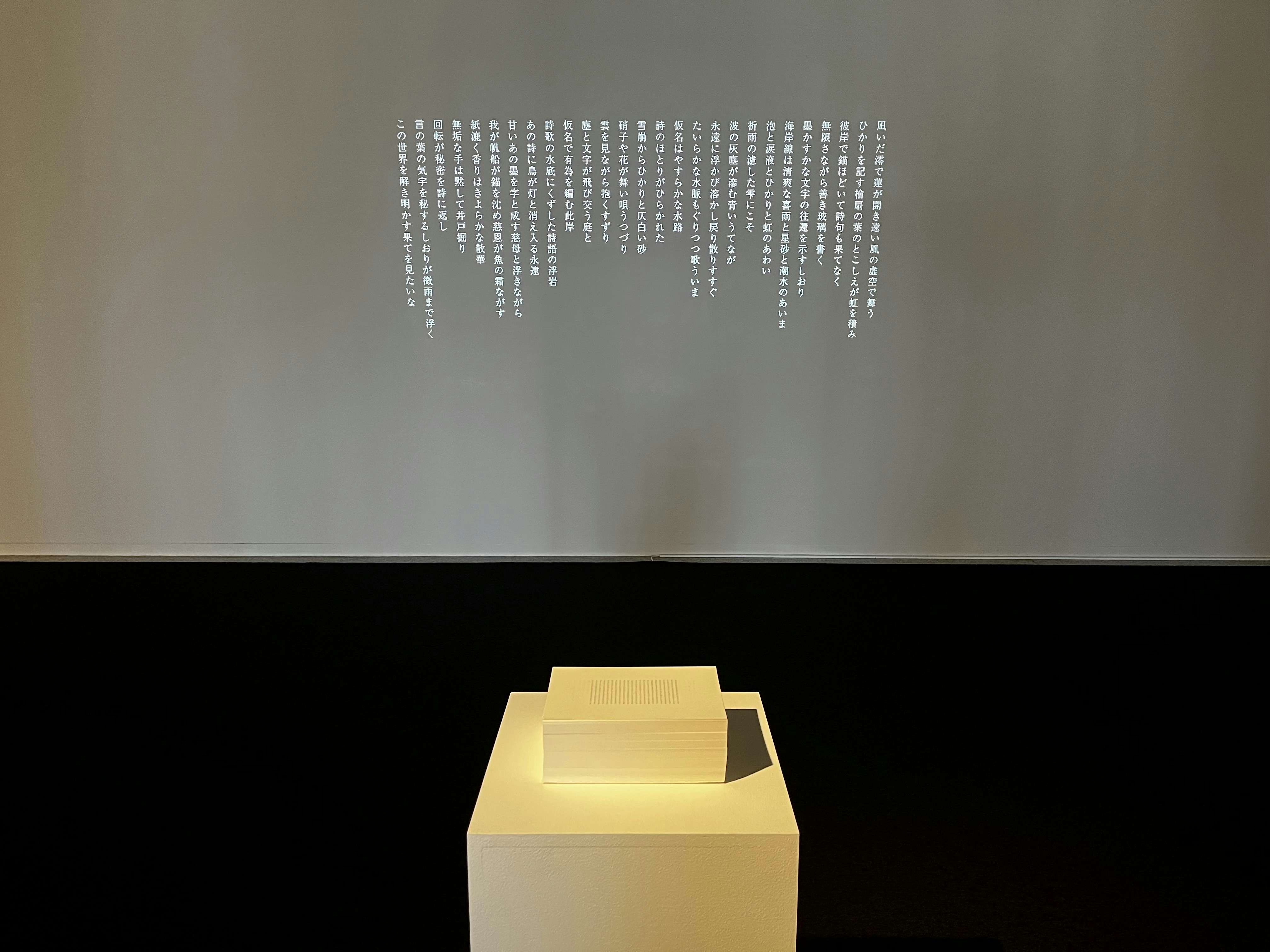 ここで、展示室入口に投影されていた、本展のために書き下ろされた回文の詩に思いを馳せる。正面の壁には、本展のために書き下ろされた回文の詩が投影されている。連ねられた言葉はひとつの詩を成しながらも、一文字一文字が粒子のように漂う。この揺らぎと、回文という終着点のない往還は、先述のインスタレーション、ひいては福田の創作に対する姿勢そのものを表している。