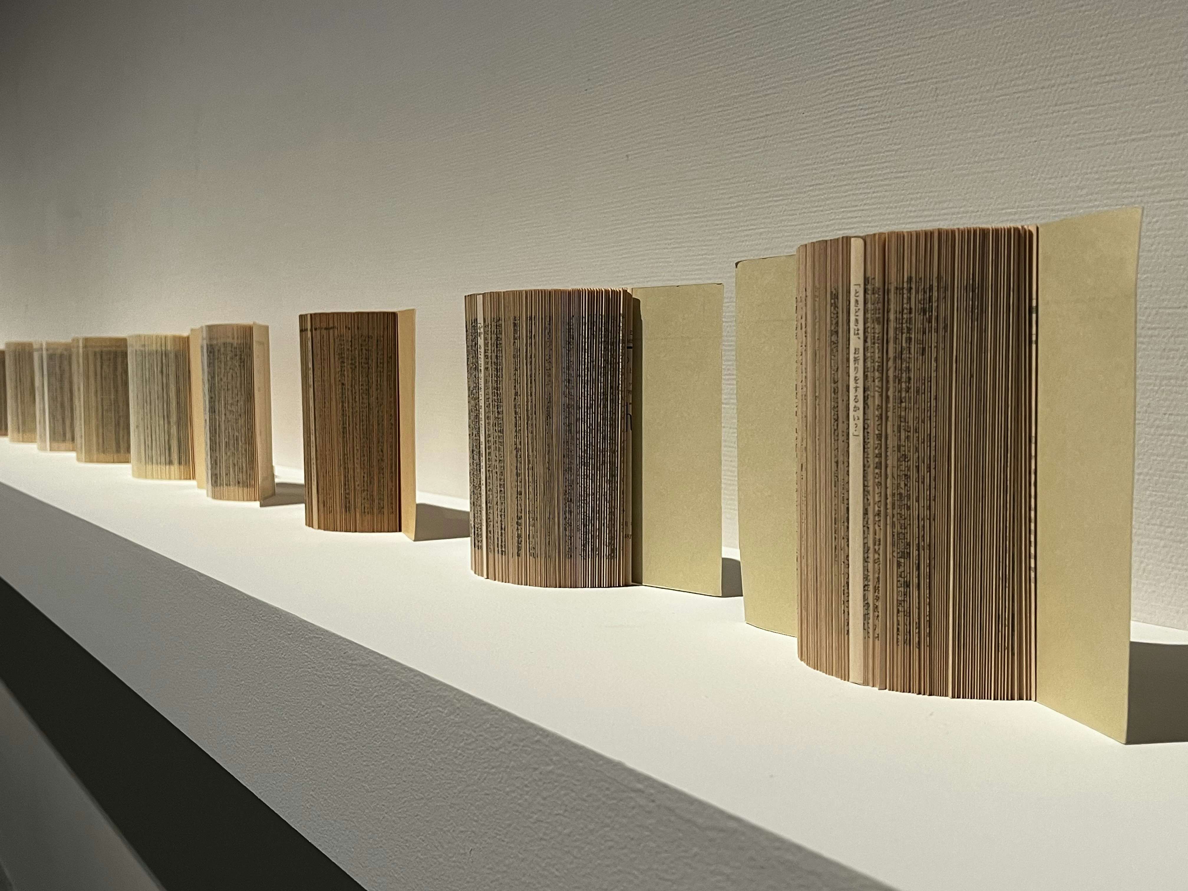 この《漂着物/波打ち際》と対をなすように配置されているのが、福田が愛読する文庫本のページを折り込んで制作された《翼あるもの/岬》(2003-25)だ。折り重なるページから立ち現れる言葉は、物語からの解体であると同時に、隣りあう本と呼応して新たな物語を紡ぎ出しているようにも見える。