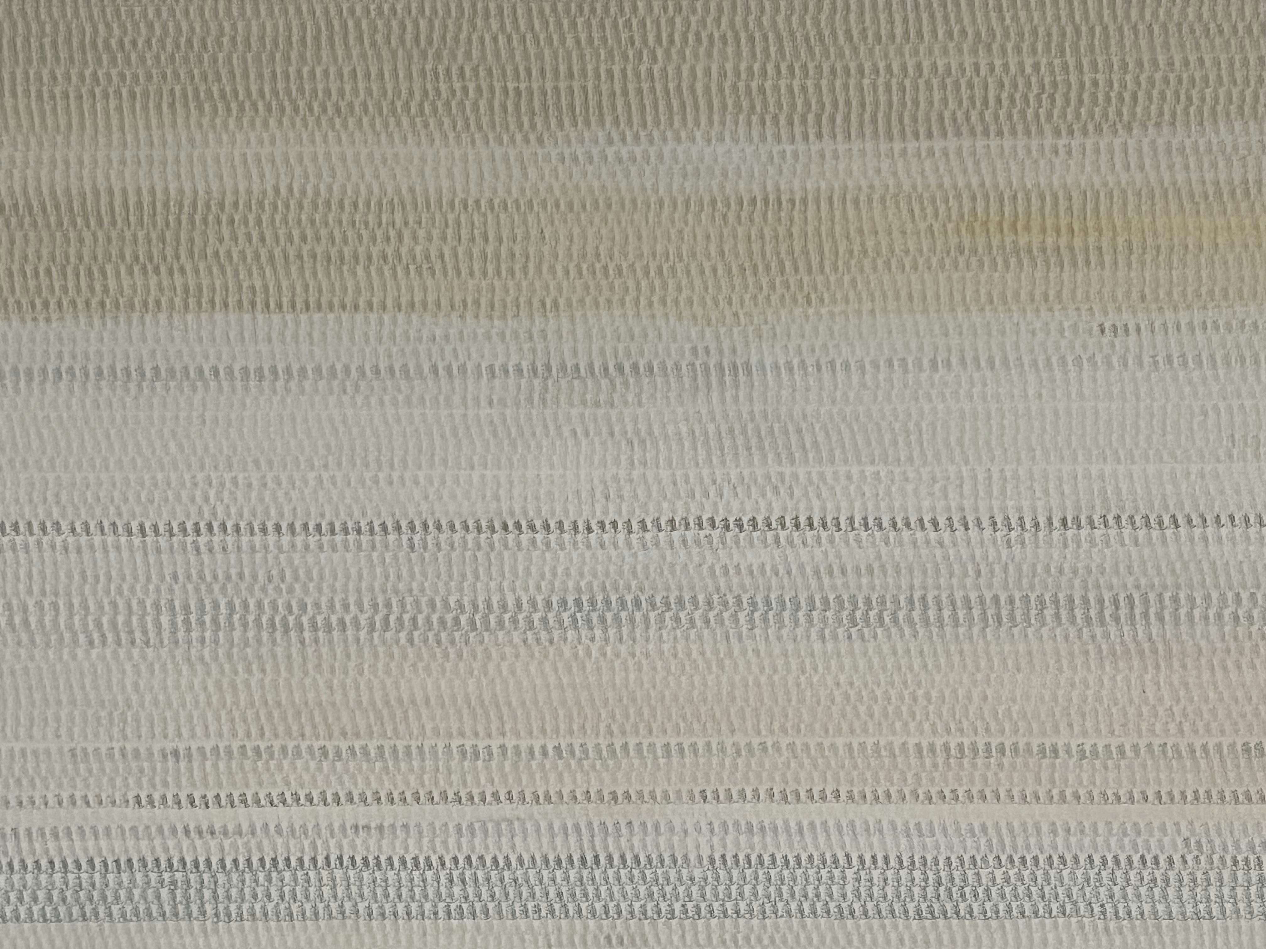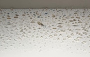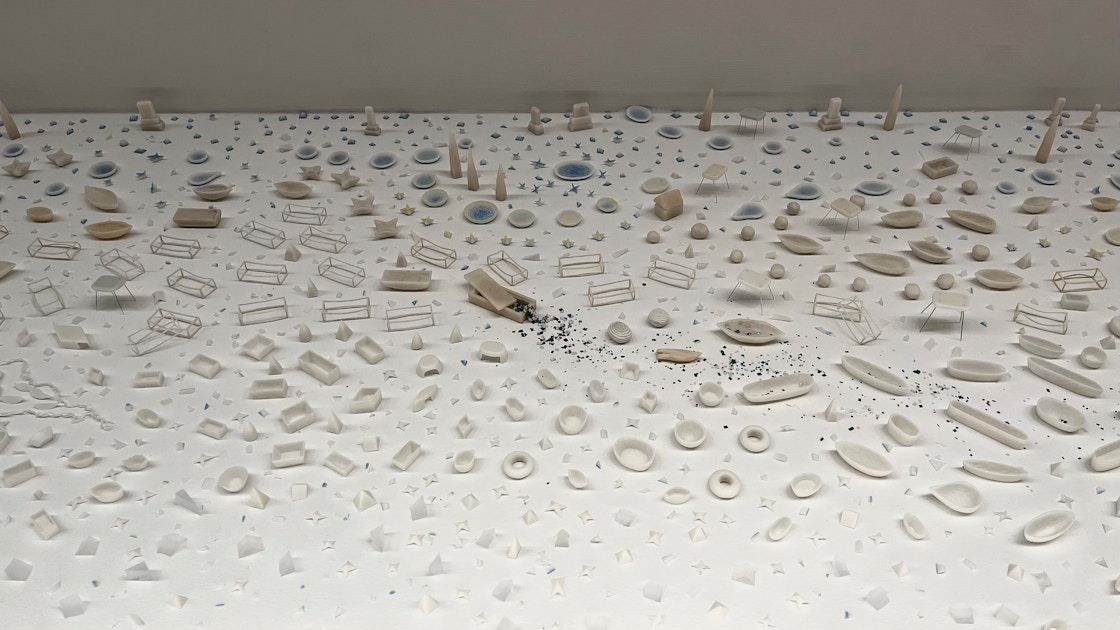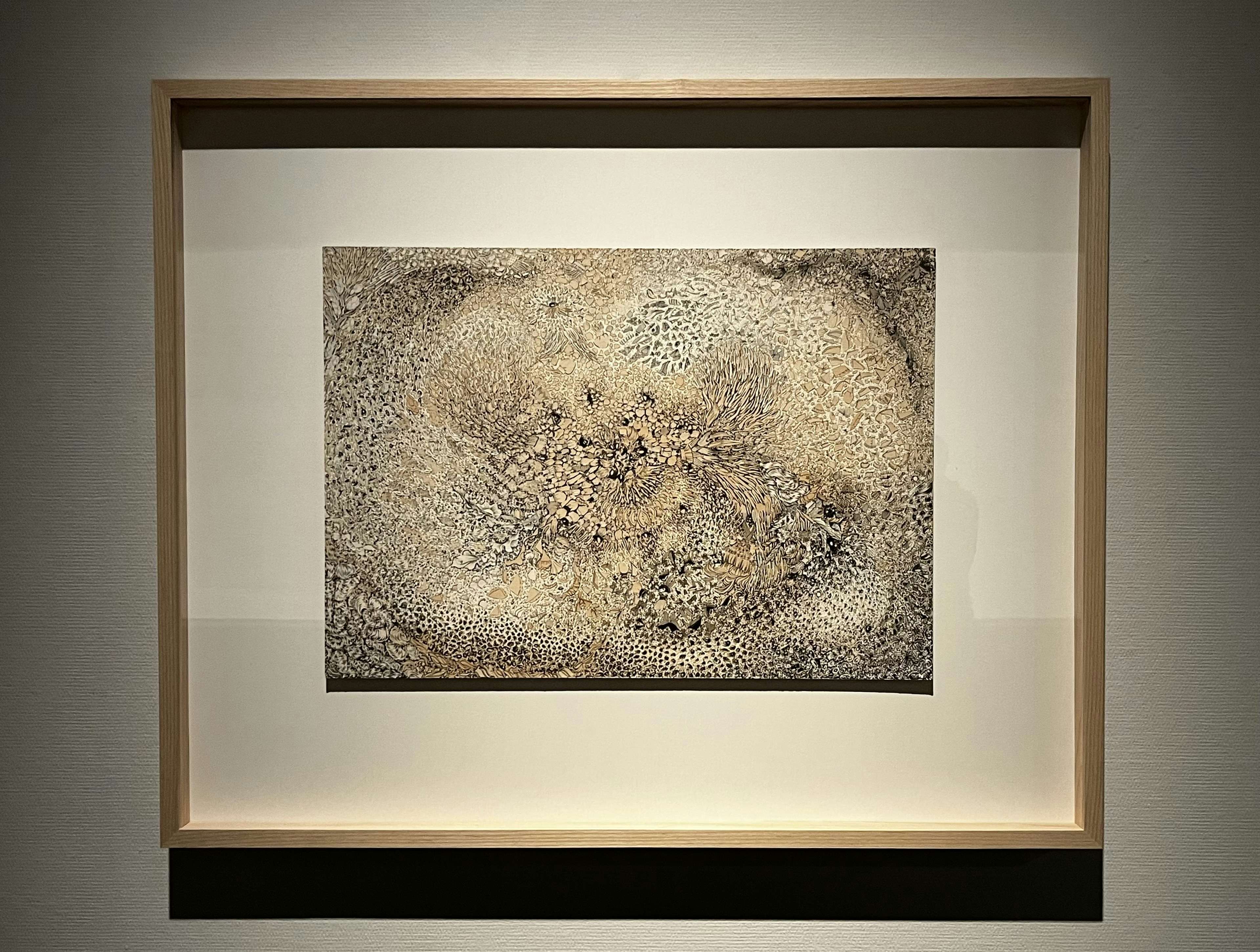 「波打ち際が、まるでリボンのように切り取られていて……」。夢のなかで見たそのイメージは、展示室のガラスケースを見た瞬間に会場のイメージへとリンクしたと福田は語る。今回、新作として発表されたインスタレーション《漂着物/波打ち際》(2002-26)は、鎌倉の地との出会いから生まれたものだ。消しゴムを彫り込んで一つずつ制作された粒子のようなピースは、作品名の通り、水の力で砕かれた石や貝殻が混ざりあう砂浜のようであり、同時に、生命の営みを俯瞰しているようにも感じられる。