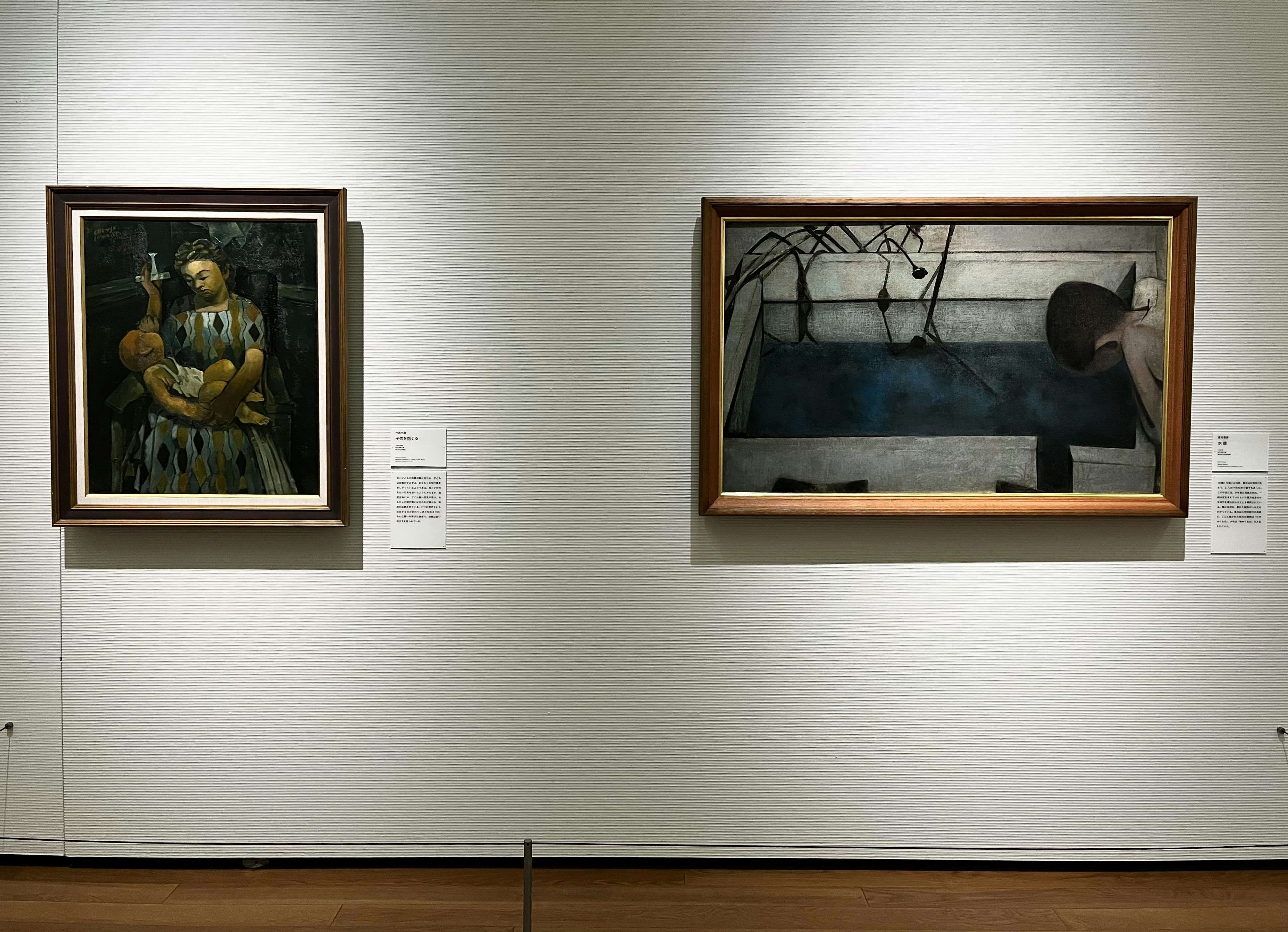 例えば、香月泰男による《水鏡》(1942)では、将来ある子供と枯れ果てた植物が同じ画面に描かれ、不穏な対比をなしている。また、同館所蔵の今西中通《子供を抱く女》(1943)は、我が子を抱きながらも、その行く末を案じるような母親の眼差しが印象的だ。