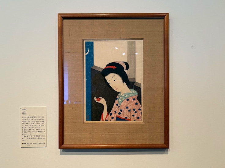 冒頭で紹介されるのは、雪岱の版画作品だ。多くは没後制作された複製版画であり、四季を描いた絹本彩色の日本画を原画に制作された作品などが紹介されている。いっぽうで会場では、生前に制作された貴重な版画《もみぢ》(大阪毎日新聞社の対外伝グラフ誌『JAPAN TODAY&TOMORROW』のために制作された)も展示されており、雪岱の版画表現の一端が垣間見える。