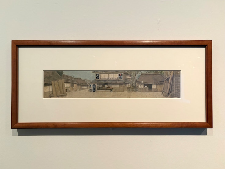 続いて舞台装置の下図も紹介されている。雪岱は、1924年に小説家・劇作家の菊池寛による『忠直行状記』で初めて舞台装置を手掛け、以降歌舞伎座を中心に数多くの舞台に携わった。会場では、小説家・劇作家の長谷川伸による『一本刀土俵入』(1931)のための舞台装置下図が展示されている。江戸時代の歌舞伎の名残が色濃かった当時の舞台に、まるで日本画のような清新な世界を創出したと高く評価された。舞台装置の下図は中間制作物であり、上演後に作家の手元に戻ることは少なく、本作は珍しく現存している貴重なものといえる。