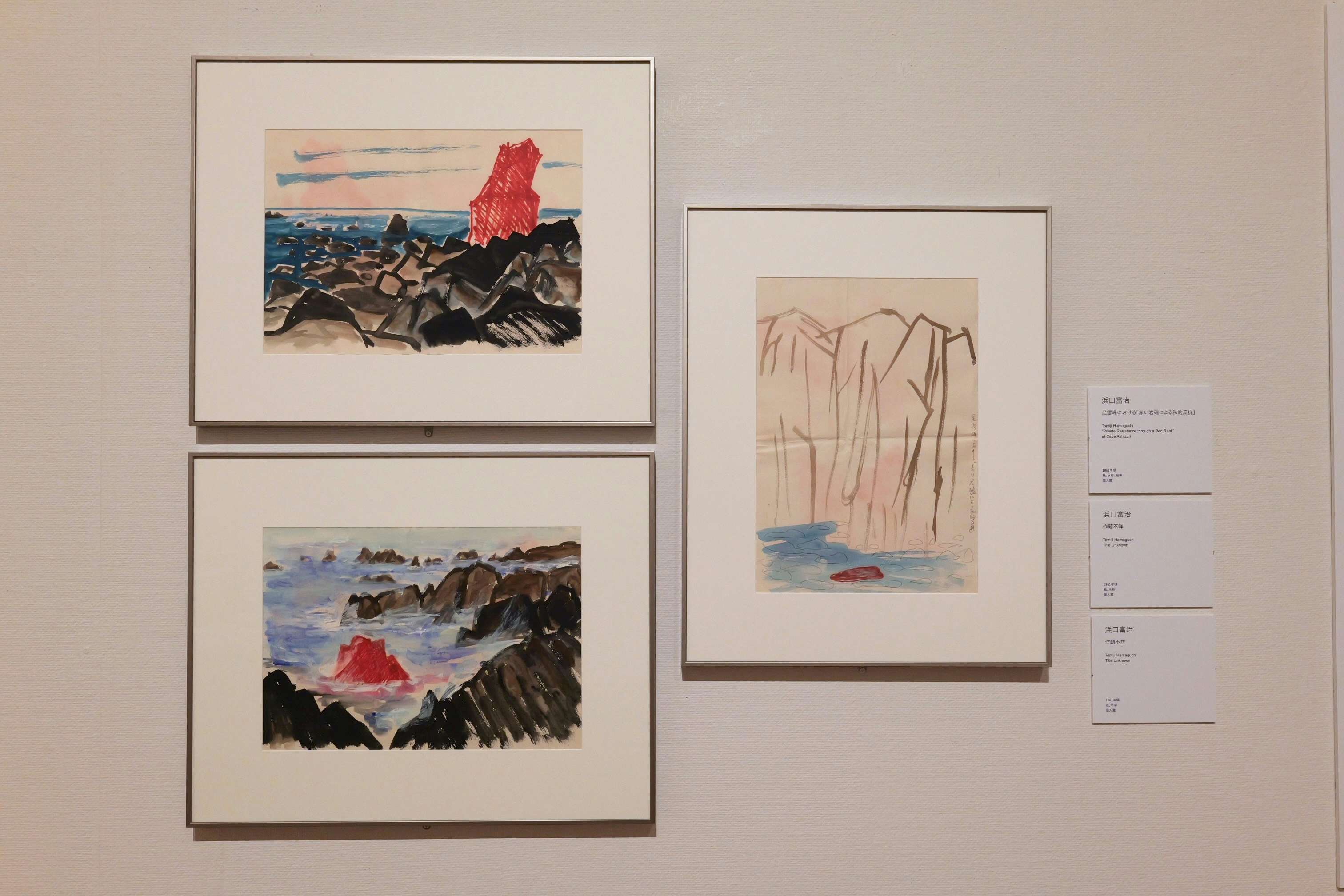 第2章「浜口富治:1950―60年代の初頭の展開」では、浜口の初期の活動を辿る。浜口は1921年に現在の香美市に生まれ、幼い頃より絵を描くことを好んでいたが、42年以降は陸軍で軍隊生活を送る。復員後に前述の県展創始者のひとりである山脇に師事して絵画制作を本格化。具象画から抽象画へと作風を変化させていった。