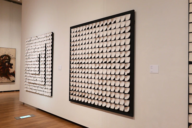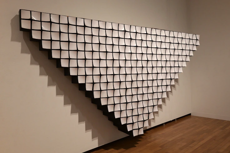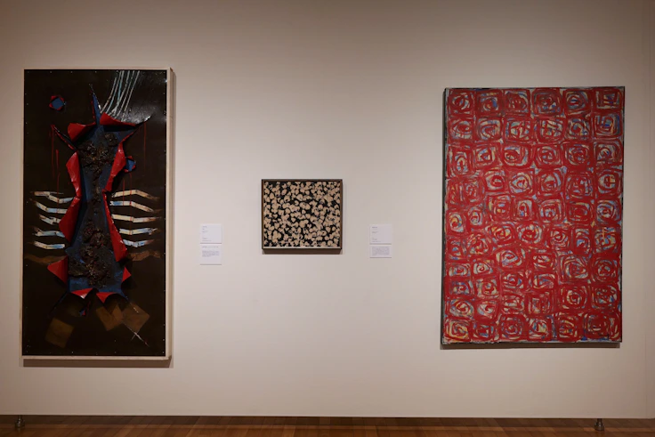 遠景として見ると不思議な像が浮かび上がり、いっぽうで近づいてみるとキャンバス片それぞれの反りに個性が見出だせる本作は、美術館に収蔵されるだけでなく、レストランなどにも展示されていた、高知の市民には馴染み深いシリーズだ。さらに67年、高﨑は関西を拠点とする「具体美術協会」に加入。具体のメンバーとの交流を深めていった。